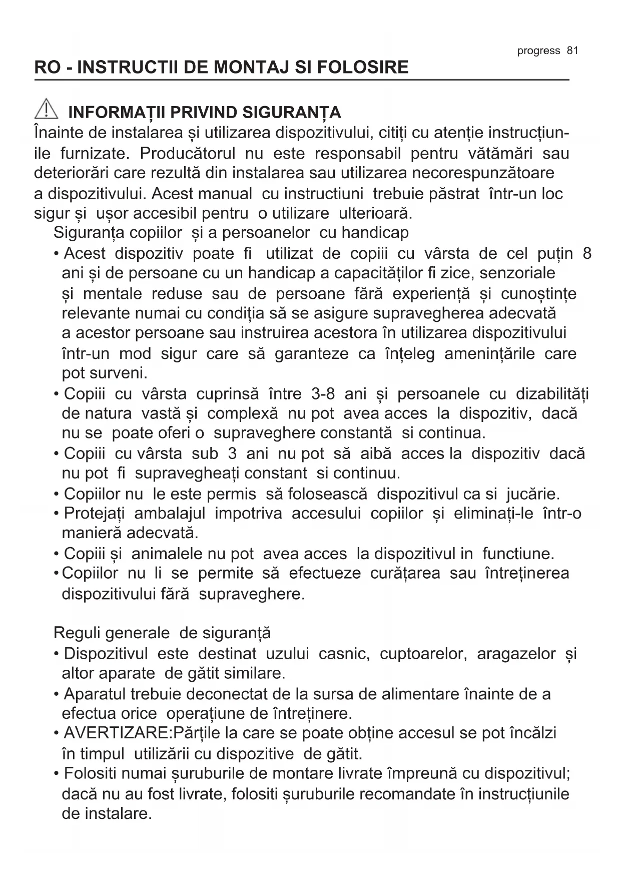 Înainte de instalarea și utilizarea dispozitivului, citiți cu atenție instrucțiun- ile furnizate. Producătorul nu este responsabil pentru vătămări sau deteriorări care rezultă din instalarea sau utilizarea necorespunzătoare a dispozitivului. Acest manual cu instructiuni trebuie păstrat într-un loc sigur și ușor accesibil pentru o utilizare ulterioară. Siguranța copiilor și a persoanelor cu handicap