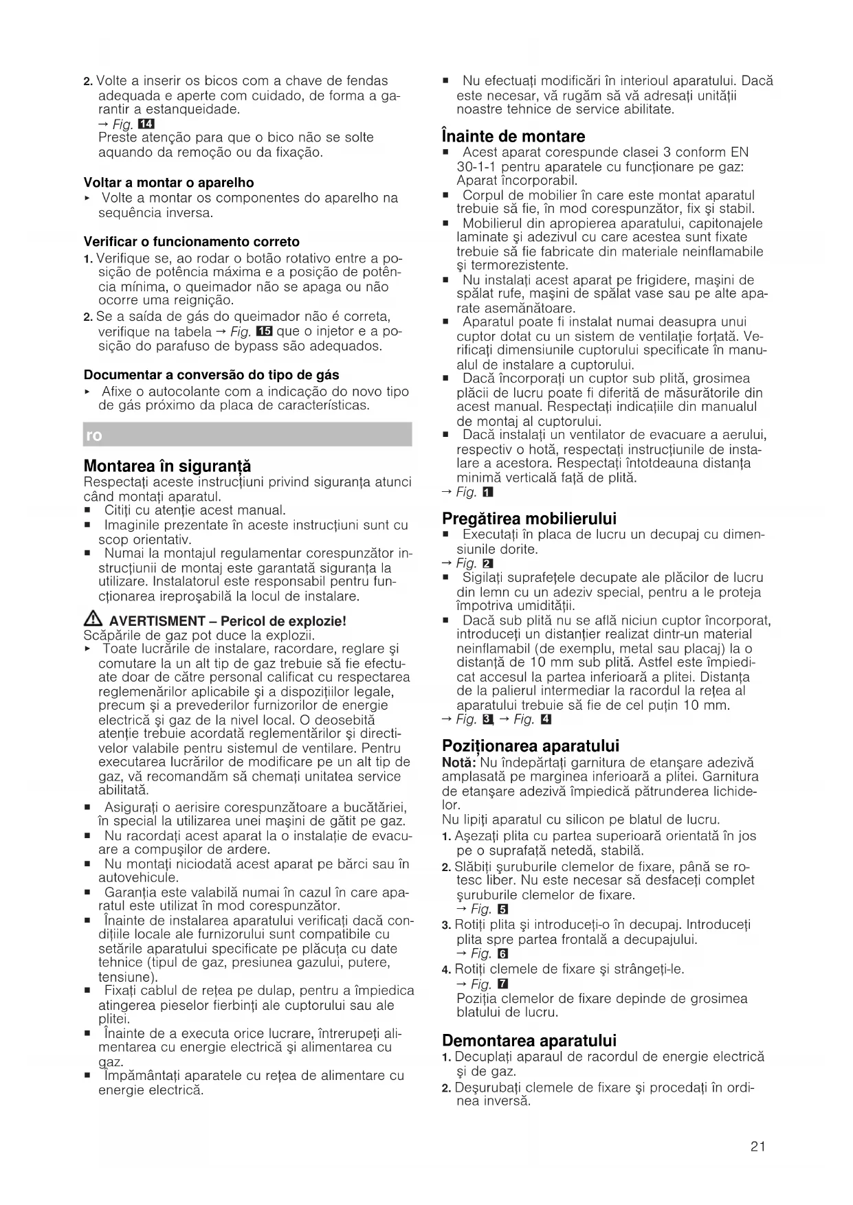 Montarea în siguranţă Respectaţi aceste instrucţiuni privind siguranţa atunci când montaţi aparatul. ¡ Citiţi cu atenţie acest manual. ¡ Imaginile prezentate în aceste instrucţiuni sunt cu scop orientativ. ¡ Numai la montajul regulamentar corespunzător in- strucţiunii de montaj este garantată siguranţa la utilizare. Instalatorul este responsabil pentru fun- cţionarea ireproşabilă la locul de instalare. AVERTISMENT‒Pericol de explozie! Scăpările de gaz pot duce la explozii. ▶ Toate lucrările de instalare, racordare, reglare şi comutare la un alt tip de gaz trebuie să fie efectu- ate doar de către personal calificat cu respectarea reglemenărilor aplicabile şi a dispoziţiilor legale, precum şi a prevederilor furnizorilor de energie electrică şi gaz de la nivel local. O deosebită atenţie trebuie acordată reglementărilor şi directi- velor valabile pentru sistemul de ventilare. Pentru executarea lucrărilor de modificare pe un alt tip de gaz, vă recomandăm să chemaţi unitatea service abilitată. ¡ Asiguraţi o aerisire corespunzătoare a bucătăriei, în special la utilizarea unei maşini de gătit pe gaz. ¡ Nu racordaţi acest aparat la o instalaţie de evacu- are a compuşilor de ardere. ¡ Nu montaţi niciodată acest aparat pe bărci sau în autovehicule. ¡ Garanţia este valabilă numai în cazul în care apa- ratul este utilizat în mod corespunzător. ¡ Înainte de instalarea aparatului verificaţi dacă con- diţiile locale ale furnizorului sunt compatibile cu setările aparatului specificate pe plăcuţa cu date tehnice (tipul de gaz, presiunea gazului, putere, tensiune). ¡ Fixaţi cablul de reţea pe dulap, pentru a împiedica atingerea pieselor fierbinţi ale cuptorului sau ale plitei. ¡ Înainte de a executa orice lucrare, întrerupeţi ali- mentarea cu energie electrică şi alimentarea cu gaz. ¡ Împământaţi aparatele cu reţea de alimentare cu energie electrică. ¡ Nu efectuaţi modificări în interioul aparatului. Dacă este necesar, vă rugăm să vă adresaţi unităţii noastre tehnice de service abilitate. Înainte de montare ¡ Acest aparat corespunde clasei 3 conform EN 30-1-1 pentru aparatele cu funcţionare pe gaz: Aparat încorporabil. ¡ Corpul de mobilier în care este montat aparatul trebuie să fie, în mod corespunzător, fix şi stabil. ¡ Mobilierul din apropierea aparatului, capitonajele laminate şi adezivul cu care acestea sunt fixate trebuie să fie fabricate din materiale neinflamabile şi termorezistente. ¡ Nu instalaţi acest aparat pe frigidere, maşini de spălat rufe, maşini de spălat vase sau pe alte apa- rate asemănătoare. ¡ Aparatul poate fi instalat numai deasupra unui cuptor dotat cu un sistem de ventilaţie forţată. Ve- rificaţi dimensiunile cuptorului specificate în manu- alul de instalare a cuptorului. ¡ Dacă încorporaţi un cuptor sub plită, grosimea plăcii de lucru poate fi diferită de măsurătorile din acest manual. Respectaţi indicaţiile din manualul de montaj al cuptorului. ¡ Dacă instalaţi un ventilator de evacuare a aerului, respectiv o hotă, respectaţi instrucţiunile de insta- lare a acestora. Respectaţi întotdeauna distanţa minimă verticală faţă de plită.