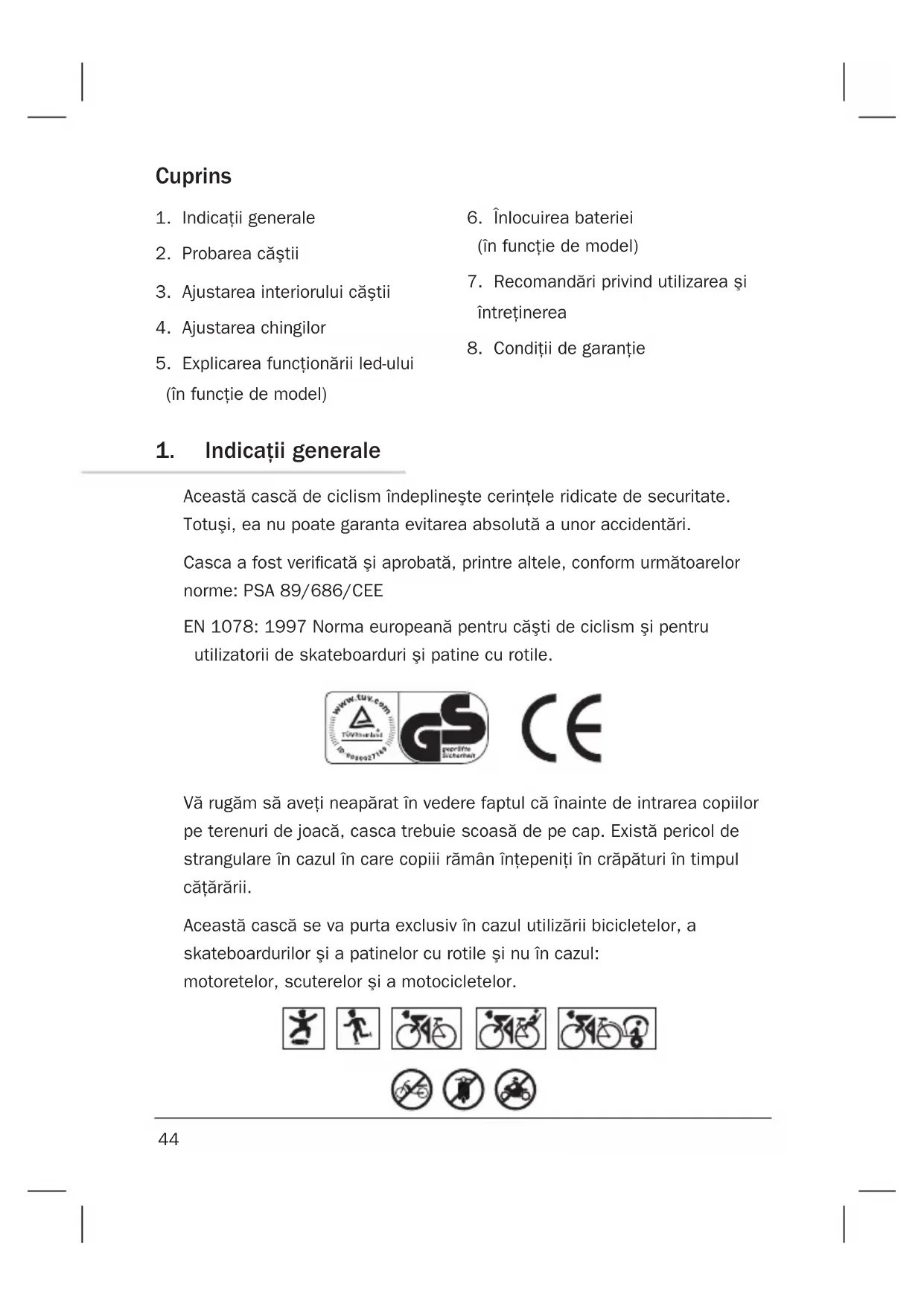 Această cască de ciclism îndeplineşte cerinţele ridicate de securitate. Totuşi, ea nu poate garanta evitarea absolută a unor accidentări. Casca a fost vericată şi aprobată, printre altele, conform următoarelor norme: PSA 89/686/CEE EN 1078: 1997 Norma europeană pentru căşti de ciclism şi pentru utilizatorii de skateboarduri şi patine cu rotile. Vă rugăm să aveţi neapărat în vedere faptul că înainte de intrarea copiilor pe terenuri de joacă, casca trebuie scoasă de pe cap. Există pericol de strangulare în cazul în care copiii rămân înţepeniţi în crăpături în timpul căţărării. Această cască se va purta exclusiv în cazul utilizării bicicletelor, a skateboardurilor şi a patinelor cu rotile şi nu în cazul: motoretelor, scuterelor şi a motocicletelor.