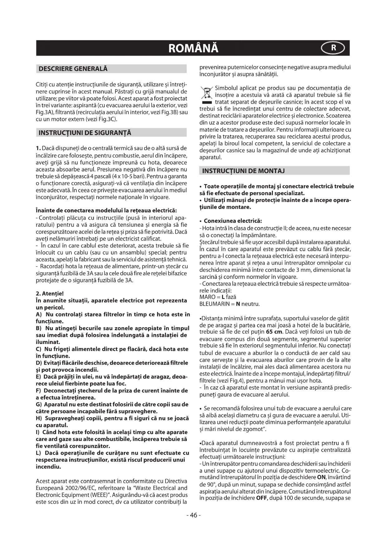 ZÓWEK. - 45 -DESCRIERE GENERALĂ Citiţi cu atenţie instrucţiunile de siguranţă, utilizare şi întreţi- nere cuprinse în acest manual. Păstraţi cu grijă manualul de utilizare; pe viitor vă poate folosi. Acest aparat a fost proiectat în trei variante: aspirantă (cu evacuarea aerului la exterior, vezi Fig.3A), filtrantă (recirculaţia aerului în interior, vezi Fig.3B) sau cu un motor extern (vezi Fig.3C).