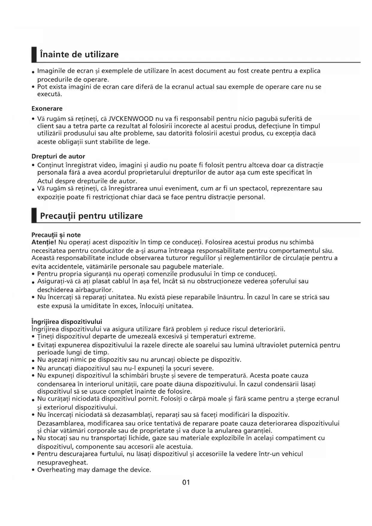 Precauții pentru instalare Precauții de utilizare Curățarea dispozitivului Dacă observați probleme cu dispozitivul, opriți alimentarea dispozitivului și contactați vânzătorul sau cel mai apropiat centru service JVCKENWOOD.03
