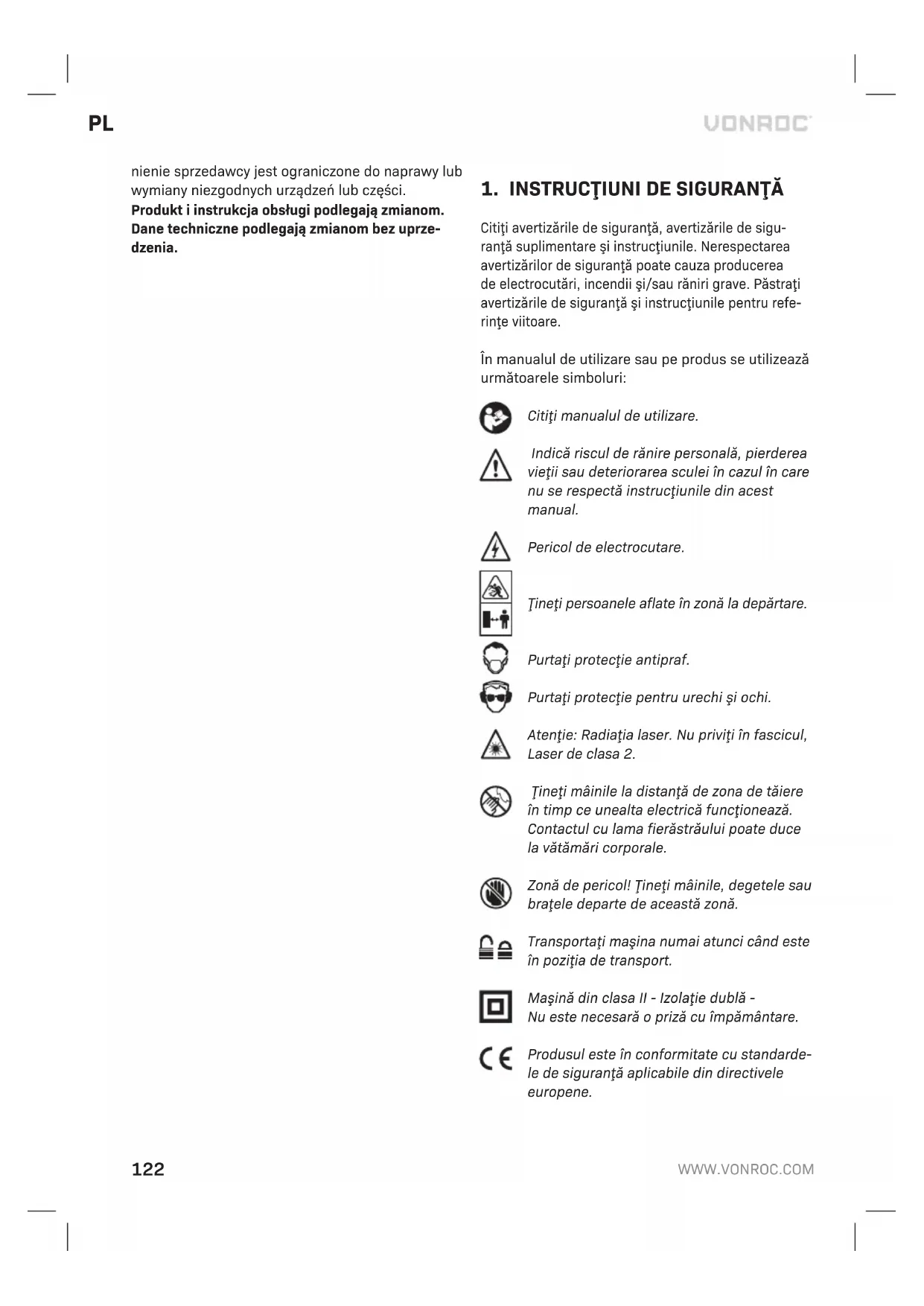 - Folosirea unor piese de schimbe neoriginale. Aceasta acoperă garanţia companiei, explicită sau implicită. Nu există alte garanţii explicite sau impli- cite care să se extindă dincolo de cele indicate aici, incluzând garanţiile, vandabilitatea sau adecvarea pentru un anumit scop. În nicio situaţie, VONROC nu este responsabil pentru daunele incidentale sau consecvenţiale. Reparaţiile efectuate de repre- zentant trebuie să fie limitate la reparaţiile sau la înlocuirea unităţilor sau apieselor neconforme. Produsul şi manualul de utilizare pot suferi modi- ficări. Specificaţiile se pot modifica fără notificare prealabilă.136