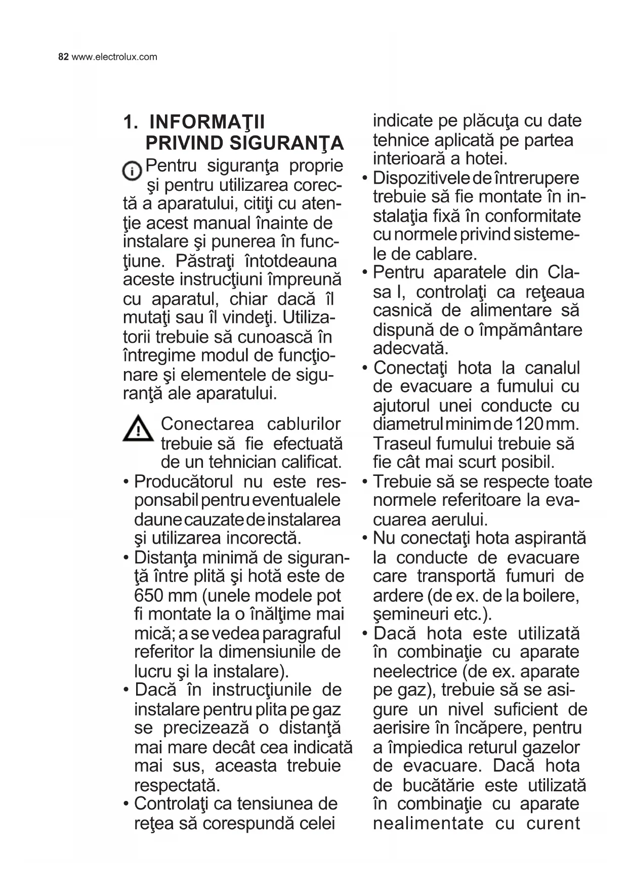 - Trebuie să existe o ventilație corespunzătoare în încăpere atunci când hota este utilizată simultan cu aparate pe gaz sau alți combustibili (nu se aplică în cazul aparatelor care descarcă exclusiv aerul în încăpere).
