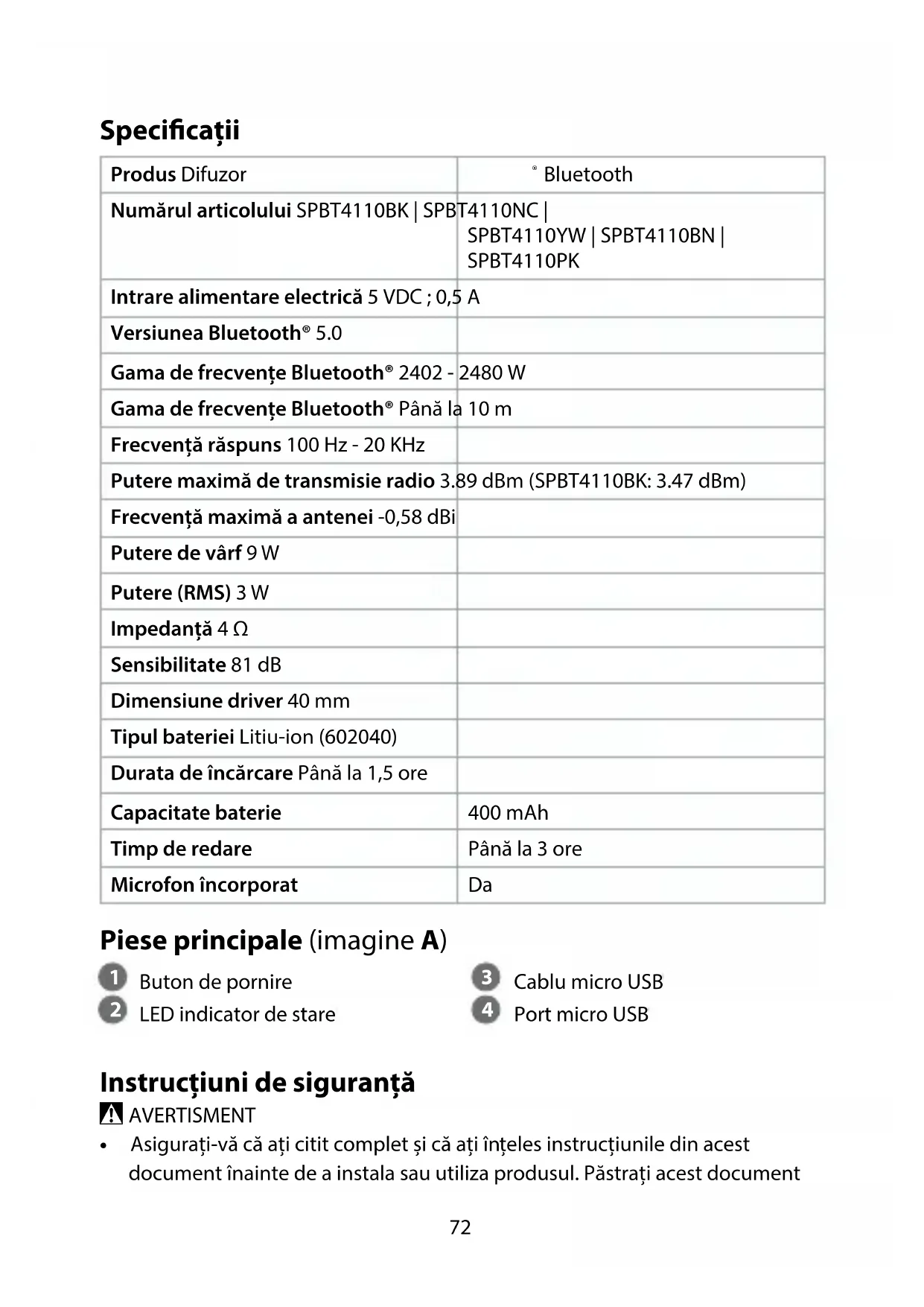 SPBT4110PK Intrare alimentare electrică 5 VDC ; 0,5 A Versiunea Bluetooth® 5.0 Gama de frecvențe Bluetooth® 2402 - 2480 W Gama de frecvențe Bluetooth® Până la 10 m Frecvență răspuns 100 Hz - 20 KHz Putere maximă de transmisie radio 3.89 dBm (SPBT4110BK: 3.47 dBm) Frecvență maximă a antenei -0,58 dBi Putere de vârf 9 W Putere (RMS) 3 W Impedanță 4 Ω Sensibilitate 81 dB Dimensiune driver 40 mm Tipul bateriei Litiu-ion (602040) Durata de încărcare Până la 1,5 ore Capacitate baterie 400 mAh Timp de redare Până la 3 ore Microfon încorporat Da Piese principale (imagine A)