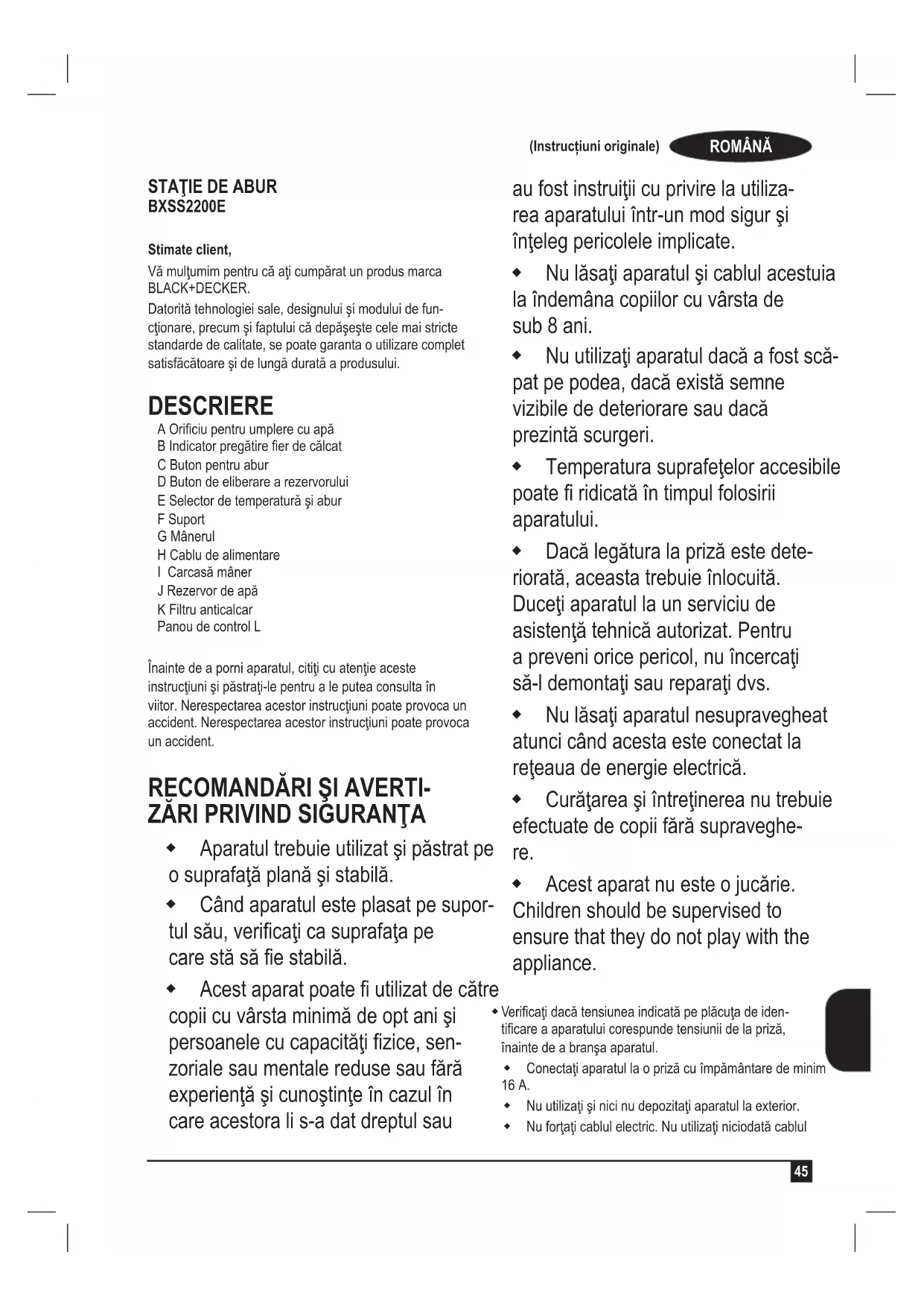BXSS2200E Stimate client, Vă mulţumim pentru că aţi cumpărat un produs marca BLACK+DECKER. Datorită tehnologiei sale, designului şi modului de fun- cţionare, precum şi faptului că depăşeşte cele mai stricte standarde de calitate, se poate garanta o utilizare complet satisfăcătoare şi de lungă durată a produsului. DESCRIERE A Oriciu pentru umplere cu apă B Indicator pregătire er de călcat C Buton pentru abur D Buton de eliberare a rezervorului E Selector de temperatură şi abur F Suport G Mânerul H Cablu de alimentare I Carcasă mâner J Rezervor de apă K Filtru anticalcar Panou de control L Înainte de a porni aparatul, citiţi cu atenţie aceste instrucţiuni şi păstraţi-le pentru a le putea consulta în viitor. Nerespectarea acestor instrucţiuni poate provoca un accident. Nerespectarea acestor instrucţiuni poate provoca un accident.
