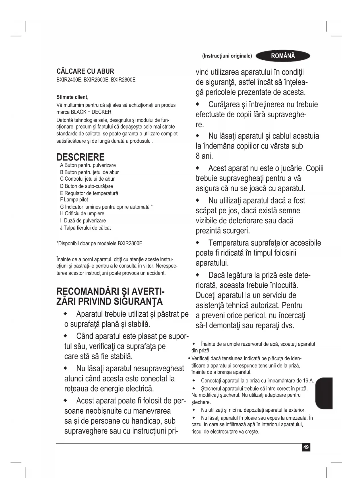 Stimate client, Vă mulțumim pentru că ați ales să achiziționați un produs marca BLACK + DECKER. Datorită tehnologiei sale, designului şi modului de fun- cţionare, precum şi faptului că depăşeşte cele mai stricte standarde de calitate, se poate garanta o utilizare complet satisfăcătoare şi de lungă durată a produsului. DESCRIERE A Buton pentru pulverizare B Buton pentru jetul de abur C Controlul jetului de abur D Buton de auto-curăţare E Regulator de temperatură F Lampa pilot G Indicator luminos pentru oprire automată * H Oriciu de umplere I Duză de pulverizare J Talpa erului de călcat *Disponibil doar pe modelele BXIR2800E Înainte de a porni aparatul, citiţi cu atenţie aceste instru- cţiuni şi păstraţi-le pentru a le consulta în viitor. Nerespec- tarea acestor instrucţiuni poate provoca un accident.