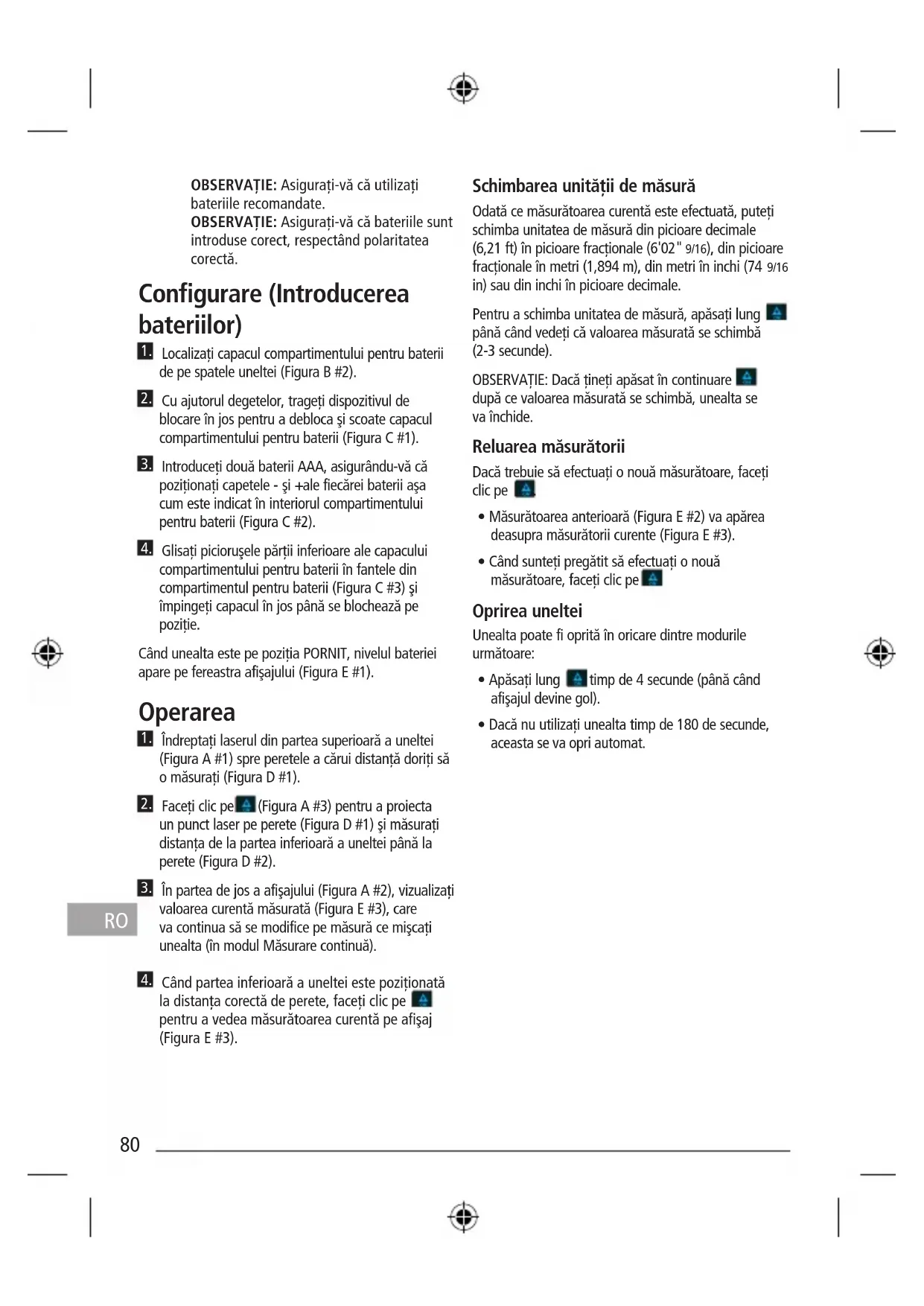 Când partea inferioară a uneltei este poziţionată la distanţa corectă de perete, faceţi clic pe pentru a vedea măsurătoarea curentă pe afişaj (Figura E #3). Schimbarea unităţii de măsură Odată ce măsurătoarea curentă este efectuată, puteţi schimba unitatea de măsură din picioare decimale (6,21 ft) în picioare fracţionale (6'02" 9/16), din picioare fracţionale în metri (1,894 m), din metri în inchi (74 9/16 in) sau din inchi în picioare decimale. Pentru a schimba unitatea de măsură, apăsaţi lung până când vedeţi că valoarea măsurată se schimbă (2-3 secunde). OBSERVAŢIE: Dacă ţineţi apăsat în continuare după ce valoarea măsurată se schimbă, unealta se va închide. Reluarea măsurătorii Dacă trebuie să efectuaţi o nouă măsurătoare, faceţi clic pe