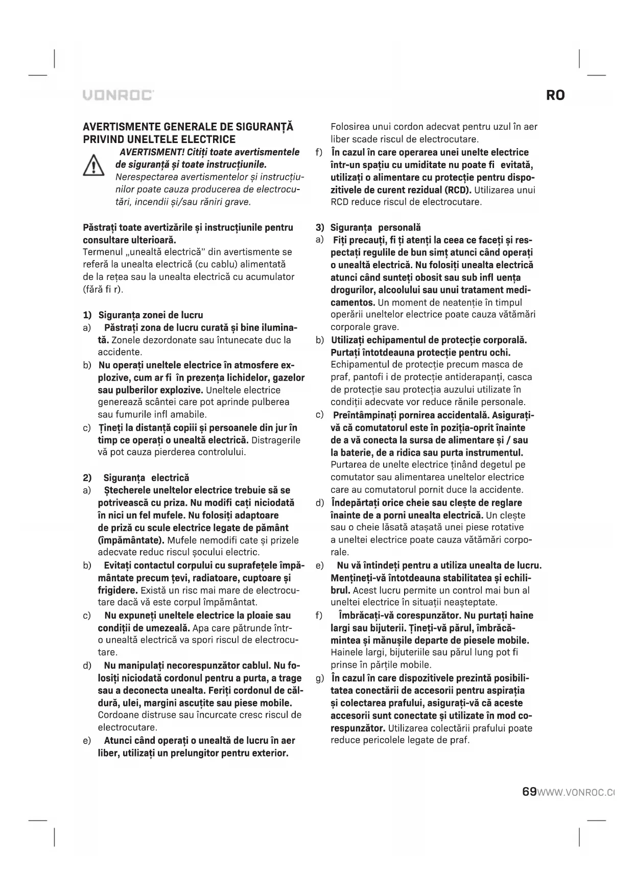 BATERIE a) Nu deschideți bateria. Pericol de scurtcircuita- re. b) Protejați bateria împotriva căldurii, de ex. împotriva expunerii puternice la soare, foc, apă și umiditate. Pericol de explozie. c) În cazul deteriorării și utilizării necorespunză- toare abateriei, pot fi emiși vapori. Ventilați zona și solicitați asistență medicală în caz de sesizări. Vaporii pot irita sistemul respirator. d) Utilizați bateria numai împreună cu produsul dvs. Vonroc. Numai această măsură protejează bateria împotriva supraîncărcării periculoase. e) Bateria poate fi deteriorată de obiecte ascuțite, cum ar fi cuie sau șurubelnițe sau prin forță aplicată extern. Poate apărea un scurtcircuit intern și bateria poate arde, exploda sau supra- încălzi.