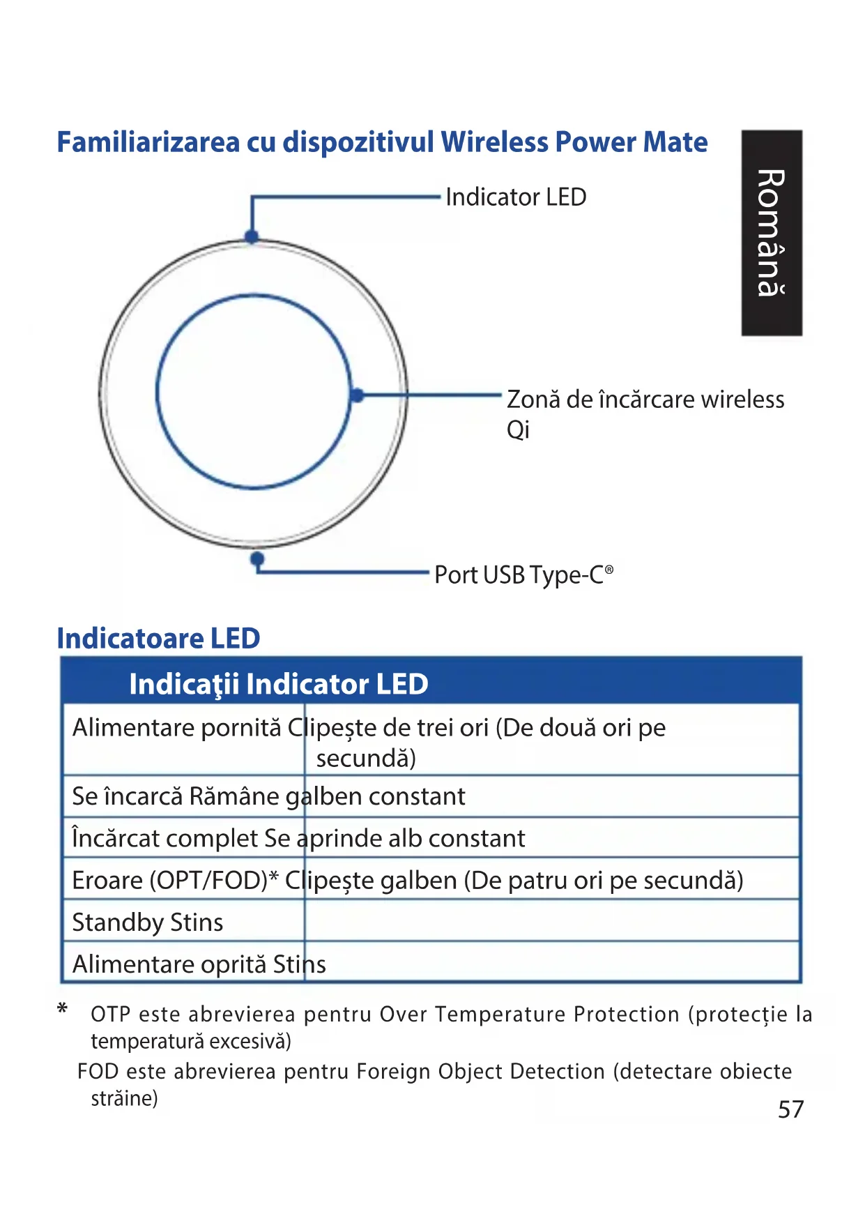 ze standardem Qi z urządzenia Wireless Power Mate.57 Familiarizarea cu dispozitivul Wireless Power Mate Indicator LED Port USB Type-C® Indicatoare LED Indicaţii Indicator LED Alimentare pornită Clipește de trei ori (De două ori pe secundă) Se încarcă Rămâne galben constant Încărcat complet Se aprinde alb constant Eroare (OPT/FOD)* Clipește galben (De patru ori pe secundă) Standby Stins Alimentare oprită Stins Zonă de încărcare wireless