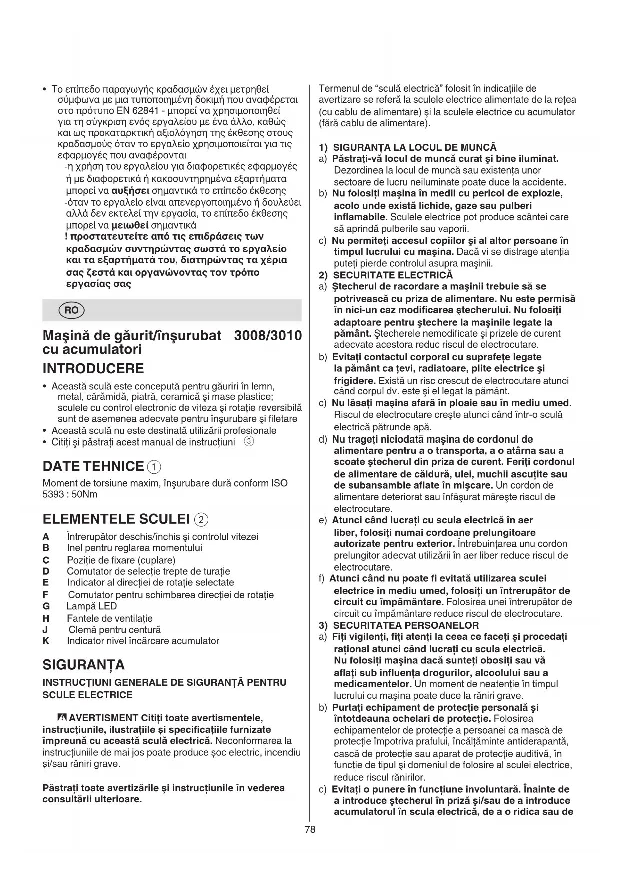 SCULE ELECTRICE - AVERTISMENT Citiţi toate avertismentele, instrucţiunile, ilustraţiile și specicaţiile furnizate împreună cu această sculă electrică. Neconformarea la instrucţiuniile de mai jos poate produce șoc electric, incendiu și/sau răniri grave. Păstraţi toate avertizările şi instrucţiunile în vederea consultării ulterioare.79 trebuie executată. Întrebuinţarea unor scule electrice destinate altor utilizări decât cele preconizate, poate duce la situaţii periculoase. h) Menţineţi mânerele şi zonele de prindere uscate, curate şi feriţi-le de ulei şi unsoare. Mânerele şi zonele de prindere alunecoase nu permit manevrarea şi controlul sigur al sculei electrice în situaţii neaşteptate.