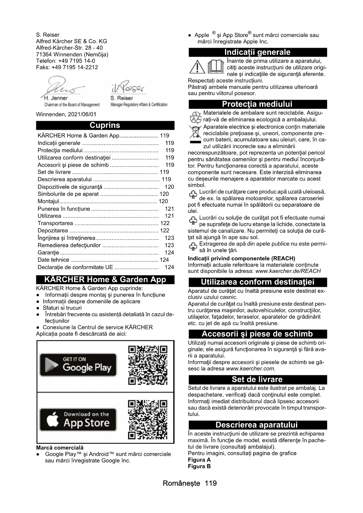 dB(A) 90 90 Control Premium Power Control K 4 Flex Power K 4 Flex PowerRomâneşte 119 S. Reiser Alfred Kärcher SE & Co. KG Alfred-Kärcher-Str. 28 - 40 71364 Winnenden (Nemčija) Telefon: +49 7195 14-0 Faks: +49 7195 14-2212 Winnenden, 2021/06/01 Cuprins KÄRCHER Home & Garden App KÄRCHER Home & Garden App cuprinde: ● Informații despre montaj și punerea în funcțiune ● Informații despre domeniile de aplicare ● Sfaturi si trucuri ● Întrebări frecvente cu asistență detaliată în cazul de- fecțiunilor ● Conexiune la Centrul de service KÄRCHER Aplicația poate fi descărcată de aici: Marcă comercială ● Google Play™ şi Android™ sunt mărci comerciale sau mărci înregistrate Google Inc. ● Apple