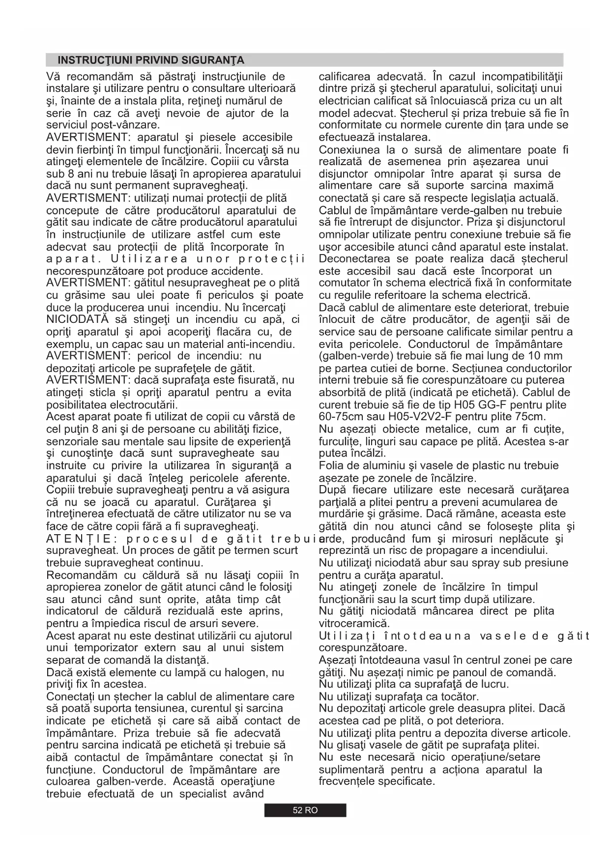 calificarea adecvată. În cazul incompatibilităţii dintre priză şi ştecherul aparatului, solicitaţi unui electrician calificat să înlocuiască priza cu un alt model adecvat. Ștecherul și priza trebuie să fie în conformitate cu normele curente din țara unde se efectuează instalarea. Conexiunea la o sursă de alimentare poate fi realizată de asemenea prin așezarea unui disjunctor omnipolar între aparat și sursa de alimentare care să suporte sarcina maximă conectată și care să respecte legislația actuală. Cablul de împământare verde-galben nu trebuie să fie întrerupt de disjunctor. Priza şi disjunctorul omnipolar utilizate pentru conexiune trebuie să fie uşor accesibile atunci când aparatul este instalat. Deconectarea se poate realiza dacă ștecherul este accesibil sau dacă este încorporat un comutator în schema electrică fixă în conformitate cu regulile referitoare la schema electrică. Dacă cablul de alimentare este deteriorat, trebuie înlocuit de către producător, de agenţii săi de service sau de persoane calificate similar pentru a evita pericolele. Conductorul de împământare (galben-verde) trebuie să fie mai lung de 10 mm pe partea cutiei de borne. Secțiunea conductorilor interni trebuie să fie corespunzătoare cu puterea absorbită de plită (indicată pe etichetă). Cablul de curent trebuie să fie de tip H05 GG-F pentru plite 60-75cm sau H05-V2V2-F pentru plite 75cm. Nu așezați obiecte metalice, cum ar fi cuțite, furculițe, linguri sau capace pe plită. Acestea s-ar putea încălzi. Folia de aluminiu şi vasele de plastic nu trebuie așezate pe zonele de încălzire. După fiecare utilizare este necesară curăţarea parţială a plitei pentru a preveni acumularea de murdărie şi grăsime. Dacă rămâne, aceasta este gătită din nou atunci când se foloseşte plita şi arde, producând fum şi mirosuri neplăcute şi reprezintă un risc de propagare a incendiului. Nu utilizaţi niciodată abur sau spray sub presiune pentru a curăţa aparatul. Nu atingeţi zonele de încălzire în timpul funcţionării sau la scurt timp după utilizare. Nu gătiţi niciodată mâncarea direct pe plita vitroceramică. Ut i l i za ț i î nt o t d ea u n a va s e l e d e g ă ti t corespunzătoare. Așezați întotdeauna vasul în centrul zonei pe care gătiţi. Nu așezați nimic pe panoul de comandă. Nu utilizaţi plita ca suprafaţă de lucru. Nu utilizaţi suprafaţa ca tocător. Nu depozitaţi articole grele deasupra plitei. Dacă acestea cad pe plită, o pot deteriora. Nu utilizaţi plita pentru a depozita diverse articole. Nu glisaţi vasele de gătit pe suprafaţa plitei. Nu este necesară nicio operațiune/setare suplimentară pentru a acționa aparatul la frecvențele specificate.53 RO Plita poate fi instalată în orice blat de lucru care rezistă la o temperatură de până la 100°C şi are o grosime de 25-45 mm. Dimensiunile cadrului în care poate fi incorporată plita sunt indicate în Figura 2. Dacă există un spaţiu care este accesibil între plita incorporabilă şi cavitatea de sub aceasta, este recomandat să fie fixat un panou de izolare (din lemn sau un material similar) (Figura 2). Dacă plita va fi fixată în apropierea unui corp de mobilier, distanţa dintre plită şi corpul de mobilier trebuie să fie de cel putin 17 cm (60cm) sau 25 cm (75cm) ( vezi Figura 2); distanţa dintre plită şi peretele din spate trebuie să fie de cel puţin 5,5 cm. Distanţa dintre plită şi orice corp de mobilier sau aparat (ex. Hotă) situat deasupra plitei trebuie să fie de minimum 70 mm (Figura 4). Obiectele de metal din sertar pot atinge temperaturi ridicate datorită recirculării aerului. Prin urmare, se recomandă utilizarea unui panou de lemn intermediar. Important Diagrama din figura 1 arată modul de aplicare a garniturii de etanşare. Plita se fixează cu ajutorul clemelor de fixare furnizate şi se utilizează găurile de la baza aparatului. Dacă instalaţi o plită de 60 cm sau 75 cm deasupra unui cuptor, acesta trebuie să fie prevăzut cu ventilator pentru răcire.