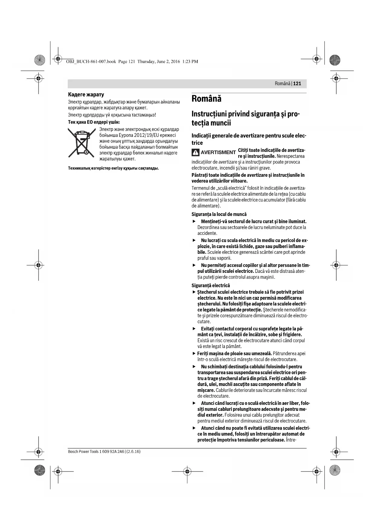 Райымбек данғылы Коммунальная көшесінің бұрышы, 169/1 Тел.: +7 (727) 232 37 07 Факс: +7 (727) 233 07 87 E-Mail: info.powertools.ka@bosch.com Ресми сайты: www.bosch.kz; www.bosch-pt.kz OBJ_BUCH-861-007.book Page 120 Thursday, June 2, 2016 1:23 PMRomână | 121 Bosch Power Tools 1 609 92A 2A6 | (2.6.16) Кәдеге жарату Электр құралдар, жабдықтар және бумаларын айналаны қорғайтын кәдеге жаратуға апару қажет. Электр құрлдарды үй қоқысына тастамаңыз! Тек қана ЕО елдері үшін: Электр және электрондық ескі құралдар бойынша Еуропа 2012/19/EU ережесі және оның ұлттық заңдарда орындалуы бойынша басқа пайдаланып болмайтын электр құралдар бөлек жиналып кәдеге жаратылуы қажет. Техникалық өзгерістер енгізу құқығы сақталады. Română Instrucţiuni privind siguranţa şi pro- tecţia muncii Indicaţii generale de avertizare pentru scule elec- trice Citiţi toate indicaţiile de avertiza- re şi instrucţiunile. Nerespectarea indicaţiilor de avertizare şi a instrucţiunilor poate provoca electrocutare, incendii şi/sau răniri grave. Păstraţi toate indicaţiile de avertizare şi instrucţiunile în vederea utilizărilor viitoare. Termenul de „sculă electrică“ folosit în indicaţiile de avertiza- re se referă la sculele electrice alimentate de la reţea (cu cablu de alimentare) şi la sculele electrice cu acumulator (fără cablu de alimentare). Siguranţa la locul de muncă Menţineţi-vă sectorul de lucru curat şi bine iluminat. Dezordinea sau sectoarele de lucru neluminate pot duce la accidente. Nu lucraţi cu scula electrică în mediu cu pericol de ex- plozie, în care există lichide, gaze sau pulberi inflama- bile. Sculele electrice generează scântei care pot aprinde praful sau vaporii. Nu permiteţi accesul copiilor şi al altor persoane în tim- pul utilizării sculei electrice. Dacă vă este distrasă aten- ţia puteţi pierde controlul asupra maşinii. Siguranţă electrică Ştecherul sculei electrice trebuie să fie potrivit prizei electrice. Nu este în nici un caz permisă modificarea ştecherului. Nu folosiţi fişe adaptoare la sculele electri- ce legate la pământ de protecţie. Ştecherele nemodifica- te şi prizele corespunzătoare diminuează riscul de electro- cutare. Evitaţi contactul corporal cu suprafeţe legate la pă- mânt ca ţevi, instalaţii de încălzire, sobe şi frigidere. Există un risc crescut de electrocutare atunci când corpul vă este legat la pământ. Feriţi maşina de ploaie sau umezeală. Pătrunderea apei într-o sculă electrică măreşte riscul de electrocutare. Nu schimbaţi destinaţia cablului folosindu-l pentru transportarea sau suspendarea sculei electrice ori pen- tru a trage ştecherul afară din priză. Feriţi cablul de căl- dură, ulei, muchii ascuţite sau componente aflate în mişcare. Cablurile deteriorate sau încurcate măresc riscul de electrocutare. Atunci când lucraţi cu o sculă electrică în aer liber, folo- siţi numai cabluri prelungitoare adecvate şi pentru me- diul exterior. Folosirea unui cablu prelungitor adecvat pentru mediul exterior diminuează riscul de electrocutare. Atunci când nu poate fi evitată utilizarea sculei electri- ce în mediu umed, folosiţi un întrerupător automat de protecţie împotriva tensiunilor periculoase. Între- AVERTISMEN