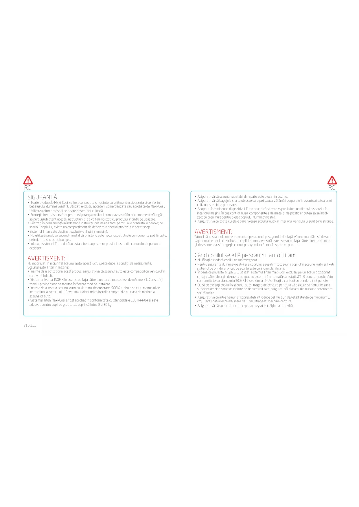 - Dacă există îndoieli cu privire la montarea sau utilizarea corectă a sistemului, este recomandat ca utilizatorul să ia legătura cu distribuitorul sau cu producătorul dispozitivului de siguranță pentru copii.214 215 RORO ÎNTREȚINERE Mențineți scaunul auto curat. Nu folosiți lubrianți sau agenți de curățare agresivi. Reductor: Reductorul inclus în scaunul auto Titan joacă un rol esențial în ceea ce privește eciența sistemului de reținere pentru copii între 9 și 15 kg, grupa 1. Reductorul poate scos, iar husa poate îndepărtată, la rândul ei, pentru spălare, dar este esențial să reașezați apoi reductorul la locul său și să utilizați exclusiv acest model ocial de reductor Titan Maxi-Cosi. Acest reductor este utilizat exclusiv cu scaunul auto Titan. Material textil: