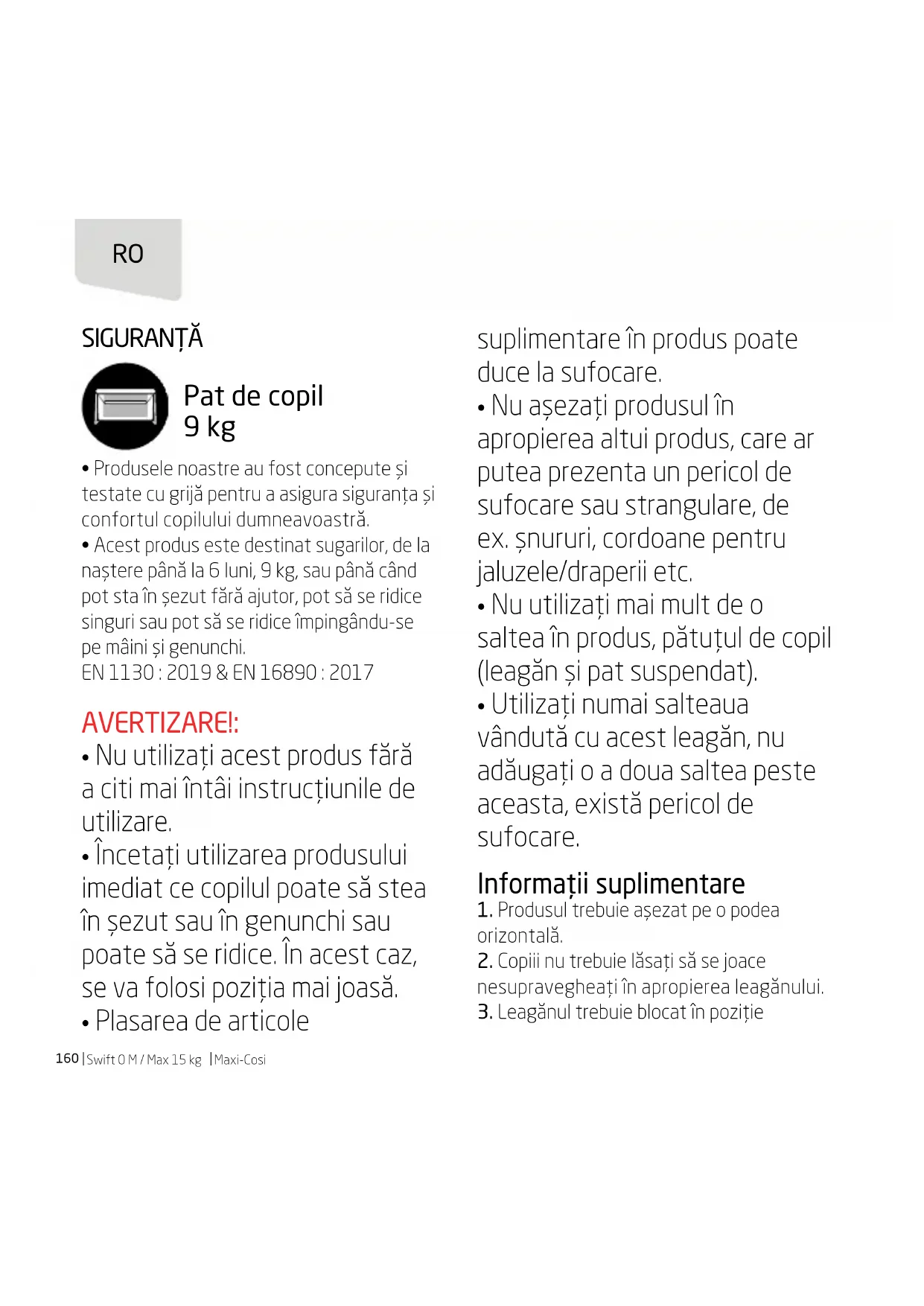 - Acest produs este destinat sugarilor, de la naștere până la 6 luni, 9 kg, sau până când pot sta în șezut fără ajutor, pot să se ridice singuri sau pot să se ridice împingându-se pe mâini și genunchi. EN 1130 : 2019 & EN 16890 : 2017 AVERTIZARE!: