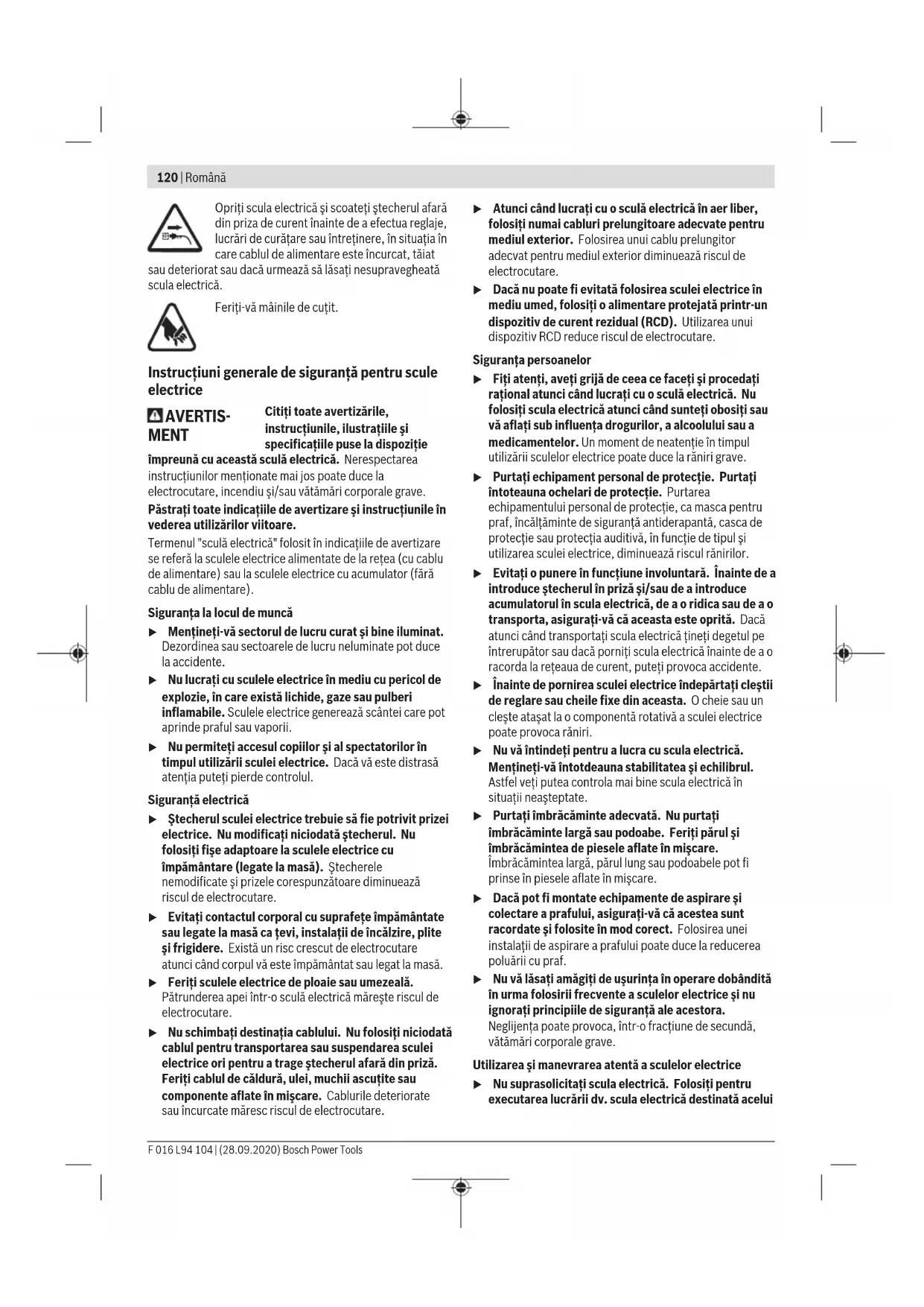– электр құралына артық жүктеме түскеннен орын алған ақаулар. (Құралға артық жүктеме түсудің шартсыз белгілеріне мыналар жатады: құбылу түсінің пайда болуы немесе электр құралы бөліктері мен түйіндерінің деформациясы немесе қорытылуы, жоғары температура әсерінен электр қозғалтқышындағы сымдар оқшаулағышының қараюы немесе көмірленуі.) Кәдеге жарату Бақ электр бұйымдарын, қосымша бөлшектер мен қорапшаларды қоршаған ортаға зиян келдірмейтіндей түрде кәдеге жарату қажет. Бақ электр бұйымдарын тұрмыстық үй қалдықтар контейнеріне салмаңыз! Тек қана ЕО елдері үшін: Электр және электрондық ескі құралдар бойынша Еуропа 2012/19/EU ережесі және ұлттық заңдарға сайкес пайдалануға жарамсыз электр құралдары бөлек жиналып, кәдеге жаратылуы қажет. Română Instrucţiuni de siguranţă Explicarea simbolurilor Citiţi instrucţiunile de folosire. A nu se folosi pe timp de ploaie. Bosch Power Tools F 016 L94 104 | (28.09.2020)120 | Română Opriţi scula electrică şi scoateţi ştecherul afară din priza de curent înainte de a efectua reglaje, lucrări de curăţare sau întreţinere, în situaţia în care cablul de alimentare este încurcat, tăiat sau deteriorat sau dacă urmează să lăsaţi nesupravegheată scula electrică. Feriți-vă mâinile de cuțit. Instrucţiuni generale de siguranţă pentru scule electrice AVERTIS- MENT Citiţi toate avertizările, instrucţiunile, ilustraţiile şi specificaţiile puse la dispoziţie împreună cu această sculă electrică. Nerespectarea instrucţiunilor menţionate mai jos poate duce la electrocutare, incendiu şi/sau vătămări corporale grave. Păstraţi toate indicaţiile de avertizare şi instrucţiunile în vederea utilizărilor viitoare. Termenul "sculă electrică" folosit în indicaţiile de avertizare se referă la sculele electrice alimentate de la reţea (cu cablu de alimentare) sau la sculele electrice cu acumulator (fără cablu de alimentare). Siguranţa la locul de muncă u Menţineţi‑vă sectorul de lucru curat şi bine iluminat. Dezordinea sau sectoarele de lucru neluminate pot duce la accidente. u Nu lucraţi cu sculele electrice în mediu cu pericol de explozie, în care există lichide, gaze sau pulberi inflamabile. Sculele electrice generează scântei care pot aprinde praful sau vaporii. u Nu permiteţi accesul copiilor şi al spectatorilor în timpul utilizării sculei electrice. Dacă vă este distrasă atenţia puteţi pierde controlul. Siguranţă electrică u Ştecherul sculei electrice trebuie să fie potrivit prizei electrice. Nu modificaţi niciodată ştecherul. Nu folosiţi fişe adaptoare la sculele electrice cu împământare (legate la masă). Ştecherele nemodificate şi prizele corespunzătoare diminuează riscul de electrocutare. u Evitaţi contactul corporal cu suprafeţe împământate sau legate la masă ca ţevi, instalaţii de încălzire, plite şi frigidere. Există un risc crescut de electrocutare atunci când corpul vă este împământat sau legat la masă. u Feriţi sculele electrice de ploaie sau umezeală. Pătrunderea apei într‑o sculă electrică măreşte riscul de electrocutare. u Nu schimbaţi destinaţia cablului. Nu folosiţi niciodată cablul pentru transportarea sau suspendarea sculei electrice ori pentru a trage ştecherul afară din priză. Feriţi cablul de căldură, ulei, muchii ascuţite sau componente aflate în mişcare. Cablurile deteriorate sau încurcate măresc riscul de electrocutare. u Atunci când lucraţi cu o sculă electrică în aer liber, folosiţi numai cabluri prelungitoare adecvate pentru mediul exterior. Folosirea unui cablu prelungitor adecvat pentru mediul exterior diminuează riscul de electrocutare. u Dacă nu poate fi evitată folosirea sculei electrice în mediu umed, folosiţi o alimentare protejată printr-un dispozitiv de curent rezidual (RCD). Utilizarea unui dispozitiv RCD reduce riscul de electrocutare. Siguranţa persoanelor u Fiţi atenţi, aveţi grijă de ceea ce faceţi şi procedaţi raţional atunci când lucraţi cu o sculă electrică. Nu folosiţi scula electrică atunci când sunteţi obosiţi sau vă aflaţi sub influenţa drogurilor, a alcoolului sau a medicamentelor. Un moment de neatenţie în timpul utilizării sculelor electrice poate duce la răniri grave. u Purtaţi echipament personal de protecţie. Purtaţi întoteauna ochelari de protecţie. Purtarea echipamentului personal de protecţie, ca masca pentru praf, încălţăminte de siguranţă antiderapantă, casca de protecţie sau protecţia auditivă, în funcţie de tipul şi utilizarea sculei electrice, diminuează riscul rănirilor. u Evitaţi o punere în funcţiune involuntară. Înainte de a introduce ştecherul în priză şi/sau de a introduce acumulatorul în scula electrică, de a o ridica sau de a o transporta, asiguraţi‑vă că aceasta este oprită. Dacă atunci când transportaţi scula electrică ţineţi degetul pe întrerupător sau dacă porniţi scula electrică înainte de a o racorda la reţeaua de curent, puteţi provoca accidente. u Înainte de pornirea sculei electrice îndepărtaţi cleştii de reglare sau cheile fixe din aceasta. O cheie sau un cleşte ataşat la o componentă rotativă a sculei electrice poate provoca răniri. u Nu vă întindeţi pentru a lucra cu scula electrică. Menţineţi-vă întotdeauna stabilitatea şi echi