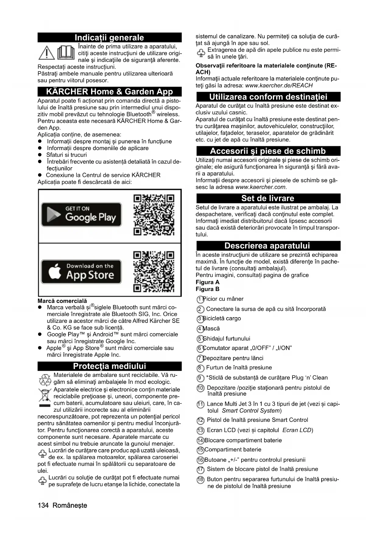 - Declaraţie de conformitate UE Chairman of the Board of Management Director Regulatory Affairs & Certification H. Jenner S. Reiser134 Româneşte Indicații generale Înainte de prima utilizare a aparatului, citiţi aceste instrucţiuni de utilizare origi- nale şi indicaţiile de siguranţă aferente. Respectați aceste instrucțiuni. Păstraţi ambele manuale pentru utilizarea ulterioară sau pentru viitorul posesor. KÄRCHER Home & Garden App Aparatul poate fi acționat prin comanda directă a pisto- lului de înaltă presiune sau prin intermediul unui dispo- zitiv mobil prevăzut cu tehnologie Bluetooth p. 140