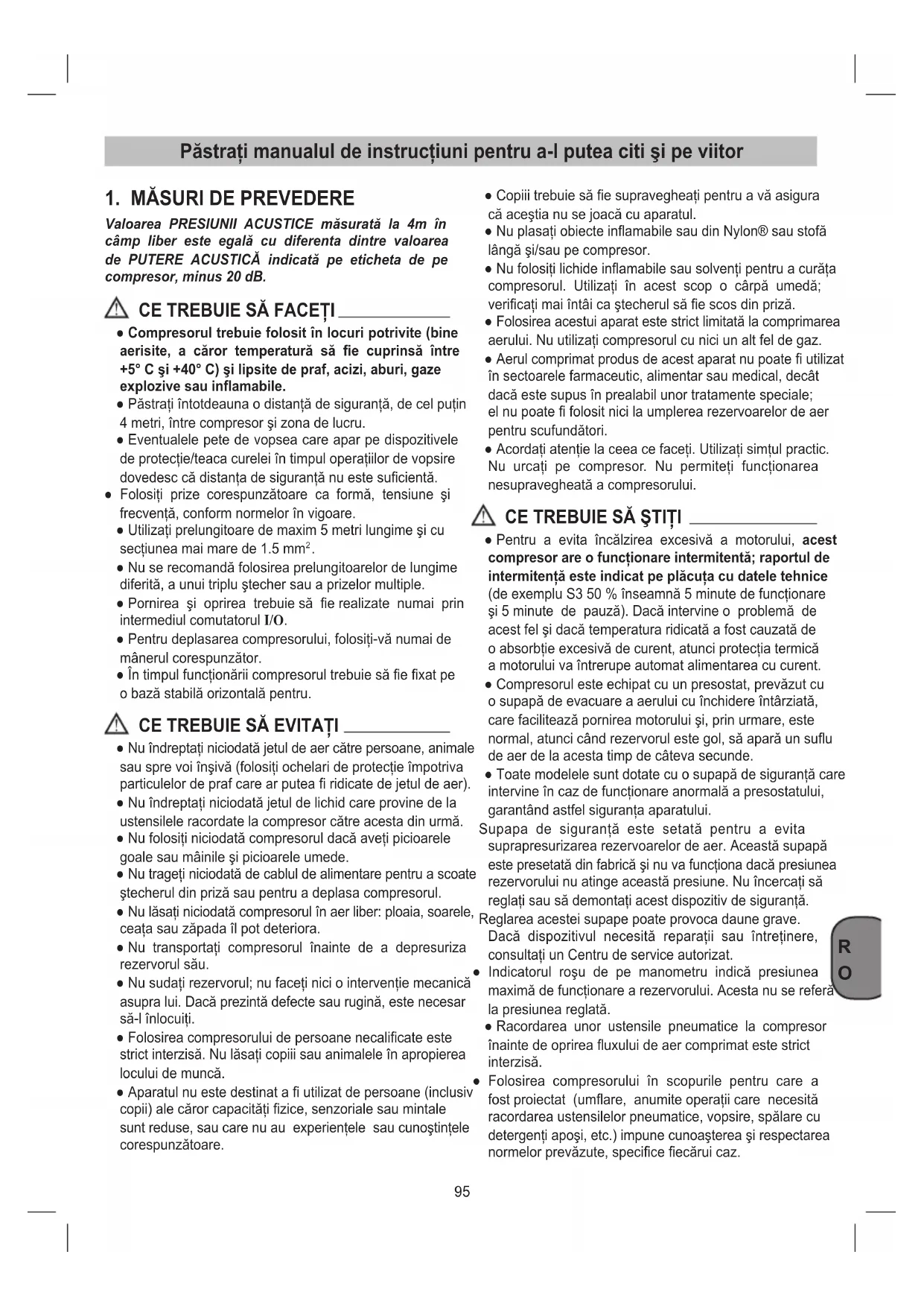 ● Pentru a evita încălzirea excesivă a motorului, acest compresor are o funcţionare intermitentă; raportul de intermitenţă este indicat pe plăcuţa cu datele tehnice (de exemplu S3 50 % înseamnă 5 minute de funcţionare şi 5 minute de pauză). Dacă intervine o problemă de acest fel şi dacă temperatura ridicată a fost cauzată de o absorbţie excesivă de curent, atunci protecţia termică a motorului va întrerupe automat alimentarea cu curent. ● Compresorul este echipat cu un presostat, prevăzut cu o supapă de evacuare a aerului cu închidere întârziată, care facilitează pornirea motorului şi, prin urmare, este normal, atunci când rezervorul este gol, să apară un suu de aer de la acesta timp de câteva secunde. ● Toate modelele sunt dotate cu o supapă de siguranţă care intervine în caz de funcţionare anormală a presostatului, garantând astfel siguranţa aparatului. Supapa de siguranţă este setată pentru a evita suprapresurizarea rezervoarelor de aer. Această supapă este presetată din fabrică şi nu va funcţiona dacă presiunea rezervorului nu atinge această presiune. Nu încercaţi să reglaţi sau să demontaţi acest dispozitiv de siguranţă. Reglarea acestei supape poate provoca daune grave. Dacă dispozitivul necesită reparaţii sau întreţinere, consultaţi un Centru de service autorizat. ● Indicatorul roşu de pe manometru indică presiunea maximă de funcţionare a rezervorului. Acesta nu se referă la presiunea reglată. ● Racordarea unor ustensile pneumatice la compresor înainte de oprirea uxului de aer comprimat este strict interzisă. ● Folosirea compresorului în scopurile pentru care a fost proiectat (umare, anumite operaţii care necesită racordarea ustensilelor pneumatice, vopsire, spălare cu detergenţi apoşi, etc.) impune cunoaşterea şi respectarea normelor prevăzute, specice ecărui caz.96