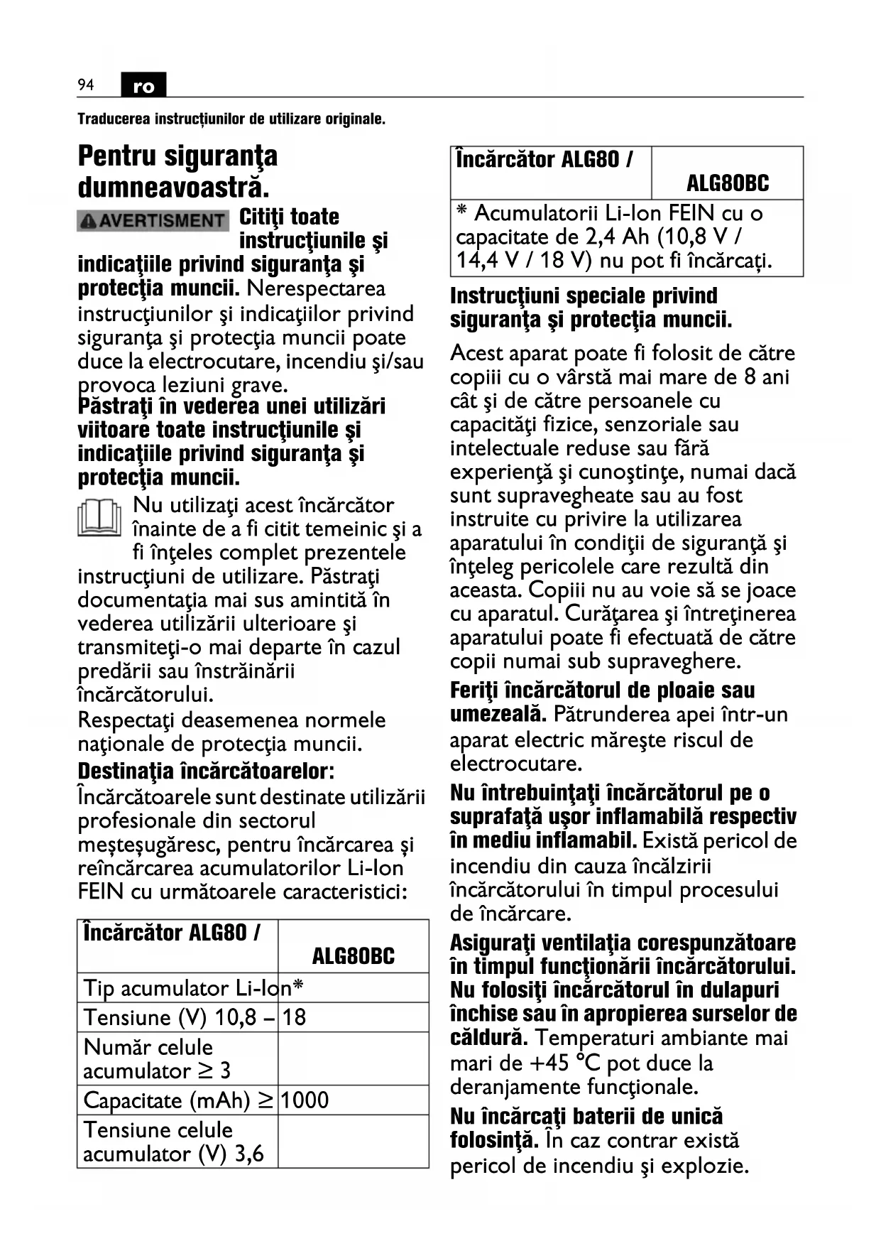 Traducerea instrucțiunilor de utilizare originale. Pentru siguranţa dumneavoastră. Citiţi toate instrucţiunile şi indicaţiile privind siguranţa şi protecţia muncii. Nerespectarea instrucţiunilor şi indicaţiilor privind siguranţa şi protecţia muncii poate duce la electrocutare, incendiu şi/sau provoca leziuni grave. Păstraţi în vederea unei utilizări viitoare toate instrucţiunile şi indicaţiile privind siguranţa şi protecţia muncii. Nu utilizaţi acest încărcător înainte de a fi citit temeinic şi a fi înţeles complet prezentele instrucţiuni de utilizare. Păstraţi documentaţia mai sus amintită în vederea utilizării ulterioare şi transmiteţi-o mai departe în cazul predării sau înstrăinării încărcătorului. Respectaţi deasemenea normele naţionale de protecţia muncii. Destinaţia încărcătoarelor: Încărcătoarele sunt destinate utilizării profesionale din sectorul meșteșugăresc, pentru încărcarea și reîncărcarea acumulatorilor Li-Ion FEIN cu următoarele caracteristici: Instrucţiuni speciale privind siguranţa şi protecţia muncii. Acest aparat poate fi folosit de către copiii cu o vârstă mai mare de 8 ani cât şi de către persoanele cu capacităţi fizice, senzoriale sau intelectuale reduse sau fără experienţă şi cunoştinţe, numai dacă sunt supravegheate sau au fost instruite cu privire la utilizarea aparatului în condiţii de siguranţă şi înţeleg pericolele care rezultă din aceasta. Copiii nu au voie să se joace cu aparatul. Curăţarea şi întreţinerea aparatului poate fi efectuată de către copii numai sub supraveghere. Feriţi încărcătorul de ploaie sau umezeală. Pătrunderea apei într-un aparat electric măreşte riscul de electrocutare. Nu întrebuinţaţi încărcătorul pe o suprafaţă uşor inflamabilă respectiv în mediu inflamabil. Există pericol de incendiu din cauza încălzirii încărcătorului în timpul procesului de încărcare. Asiguraţi ventilaţia corespunzătoare în timpul funcţionării încărcătorului. Nu folosiţi încărcătorul în dulapuri închise sau în apropierea surselor de căldură. Temperaturi ambiante mai mari de +45 °C pot duce la deranjamente funcţionale. Nu încărcaţi baterii de unică folosinţă. În caz contrar există pericol de incendiu şi explozie. Încărcător ALG80 / ALG80BC Tip acumulator Li-Ion* Tensiune (V) 10,8 – 18 Număr celule acumulator ≥ 3 Capacitate (mAh) ≥ 1000 Tensiune celule acumulator (V) 3,6