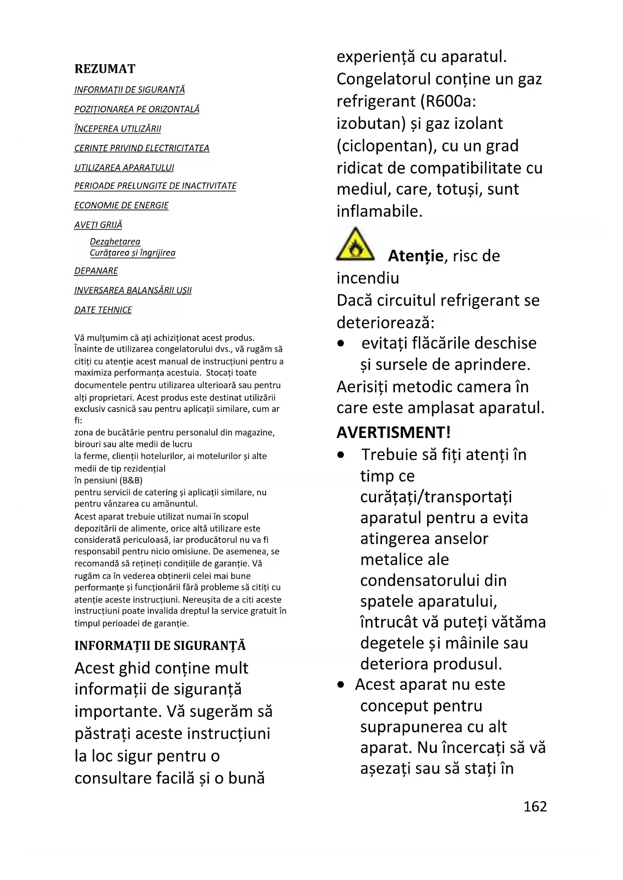 Acest ghid conține mult informații de siguranță importante. Vă sugerăm să păstrați aceste instrucțiuni la loc sigur pentru o consultare facilă și o bună experiență cu aparatul. Congelatorul conține un gaz refrigerant (R600a: izobutan) și gaz izolant (ciclopentan), cu un grad ridicat de compatibilitate cu mediul, care, totuși, sunt inflamabile. Atenție, risc de incendiu Dacă circuitul refrigerant se deteriorează: