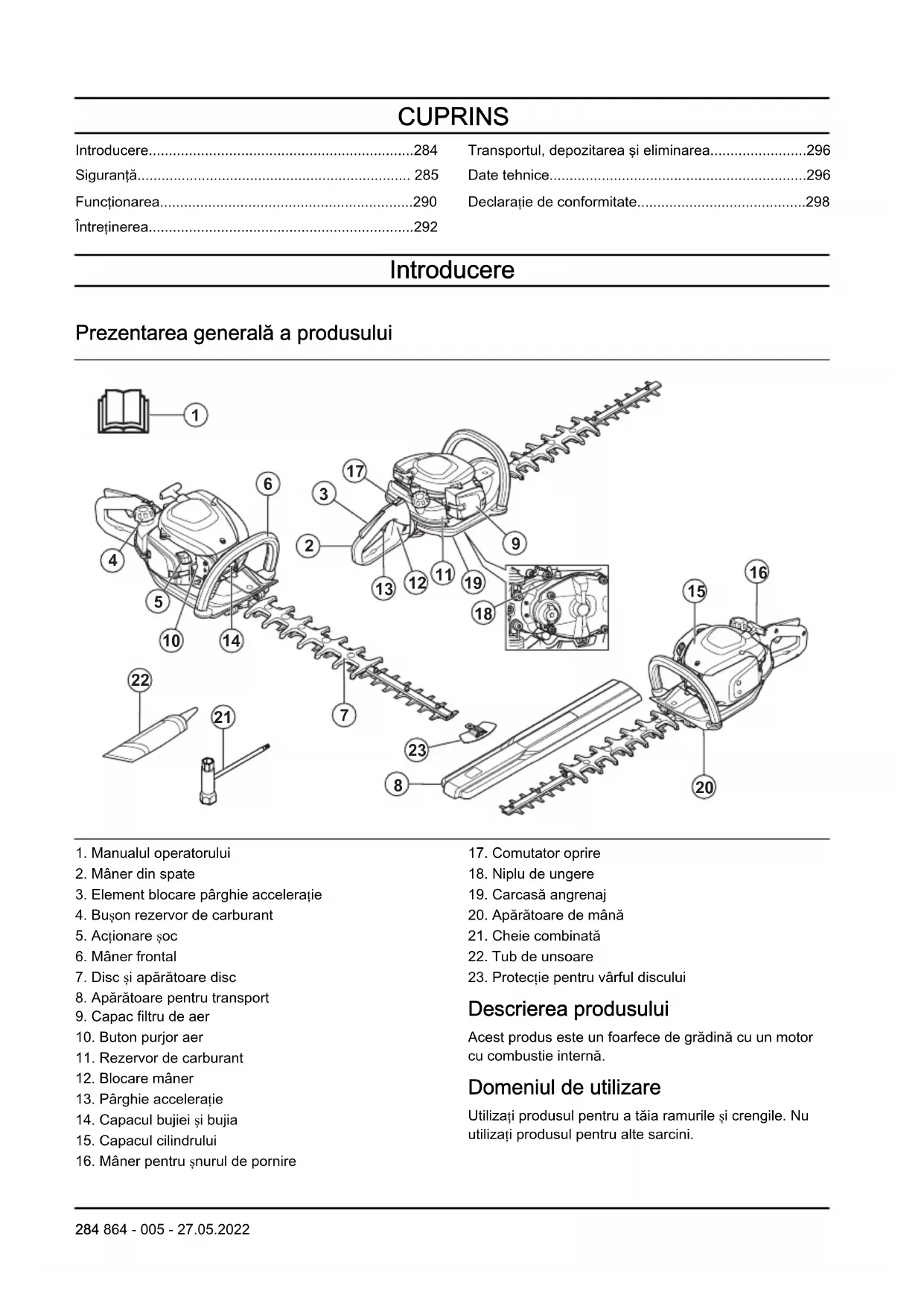 Descrierea produsului Acest produs este un foarfece de grădină cu un motor cu combustie internă. Domeniul de utilizare Utilizați produsul pentru a tăia ramurile și crengile. Nu utilizați produsul pentru alte sarcini. 284 864 - 005 - 27.05.2022Simbolurile de pe produs Oprire. Acționați cu grijă și utilizați corect produsul. Acest produs poate cauza vătămări corporale grave sau decesul operatorului sau al altor persoane. Citiți cu atenție manualul operatorului și asigurați-vă că înțelegeți instrucțiunile înainte de utilizare. Utilizați protecția de auz și ochelarii de protecție aprobați. Utilizați mănuși de protecție omologate. Utilizați ghete pentru regim greu de lucru, rezistente la alunecare. Șurub de reglare a mersului în gol. Ac pentru turație ridicată. Ac pentru turație redusă. Emisiile de zgomot în mediu, conform Directivei Europene 2000/14/CE și a Regulamentului New South Wales din 2017 privind operațiunile de protecție a mediului (controlul zgomotului). Datele privind emisiile de zgomot pot fi găsite pe eticheta utilajului și la capitolul Date tehnice. Produsul este în conformitate cu directivele CE aplicabile. Acest produs este în conformitate cu reglementările aplicabile din Regatul Unit. aaaassxxxx Plăcuța de identificare indică seria. aaaa este anul fabricației și ss este săptămâna fabricației. Nota: Celelalte simboluri/autocolante de pe produs se referă la cerințele de certificare pentru unele piețe. Emisiile de Euro V AVERTISMENT: În urma modificării neautorizate a motorului, este anulată aprobarea de tip UE pentru acest produs. Siguranţă Definiții privind siguranța Avertismentele, atenționările și notele sunt utilizate pentru a desemna părți foarte importante din manual. AVERTISMENT: Se utilizează dacă există risc de vătămare sau de deces pentru operator sau pentru trecători, în cazul în care instrucțiunile din manual nu sunt respectate. ATENŢIE: Se utilizează dacă există un risc de deteriorare a produsului, a altor materiale sau a zonelor învecinate, dacă instrucțiunile din manual nu sunt respectate. Nota: Se utilizează pentru a furniza mai multe informații care sunt necesare într-o situație dată. Instrucțiuni generale de siguranță AVERTISMENT: Înainte de a utiliza produsul, citiți instrucțiunile de avertizare de mai jos.