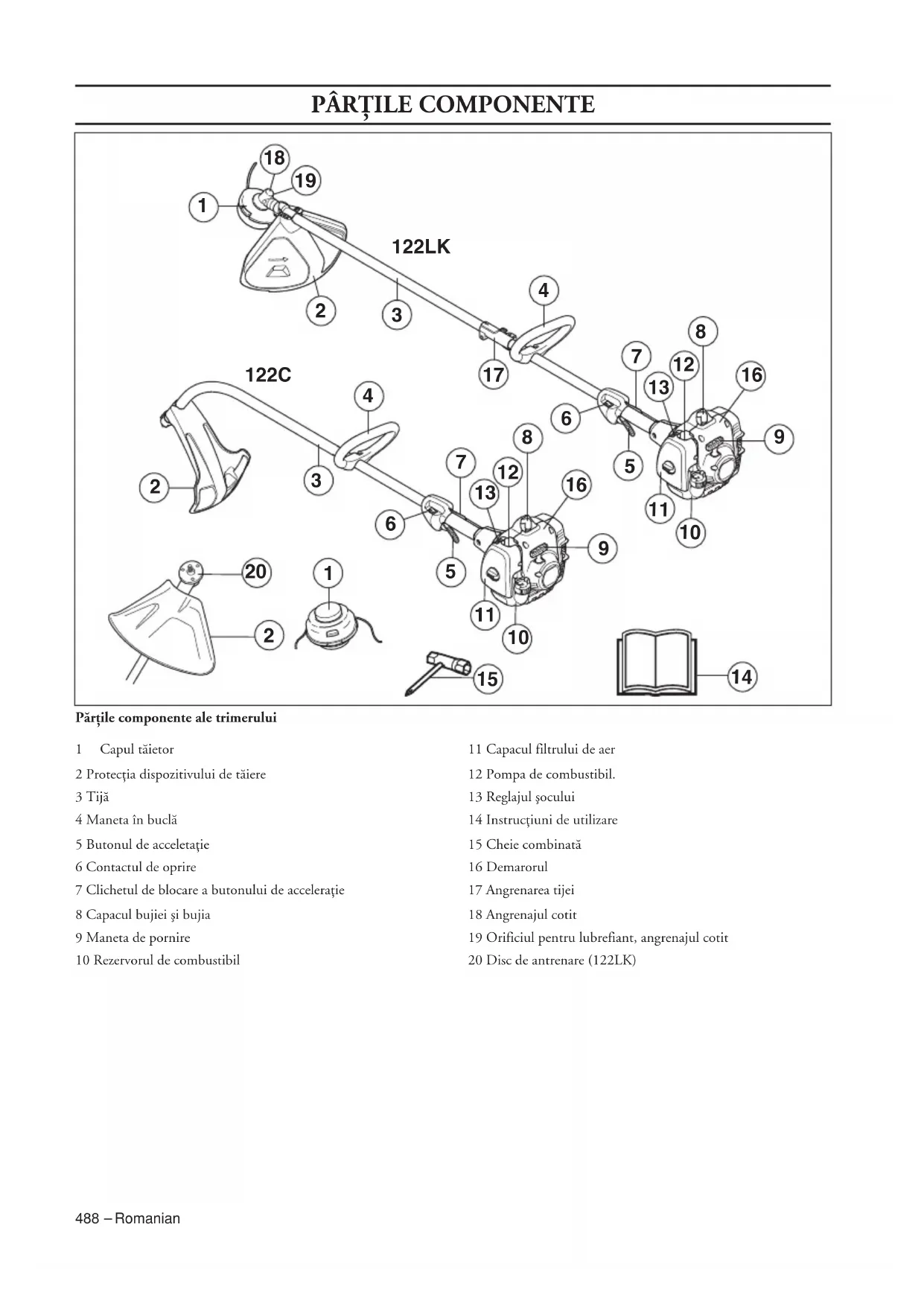 Capul tãietor 2 Protecöia dispozitivului de tãiere 3 Tijã 4 Maneta în buclã 5 Butonul de acceletaöie 6 Contactul de oprire 7 Clichetul de blocare a butonului de acceleraöie 8 Capacul bujiei äi bujia 9 Maneta de pornire 10 Rezervorul de combustibil 11 Capacul filtrului de aer 12 Pompa de combustibil. 13 Reglajul äocului 14 Instrucöiuni de utilizare 15 Cheie combinatã 16 Demarorul 17 Angrenarea tijei 18 Angrenajul cotit 19 Orificiul pentru lubrefiant, angrenajul cotit 20 Disc de antrenare (122LK)MÂSURI GENERALE DE PROTECÖIA MUNCII Romanian