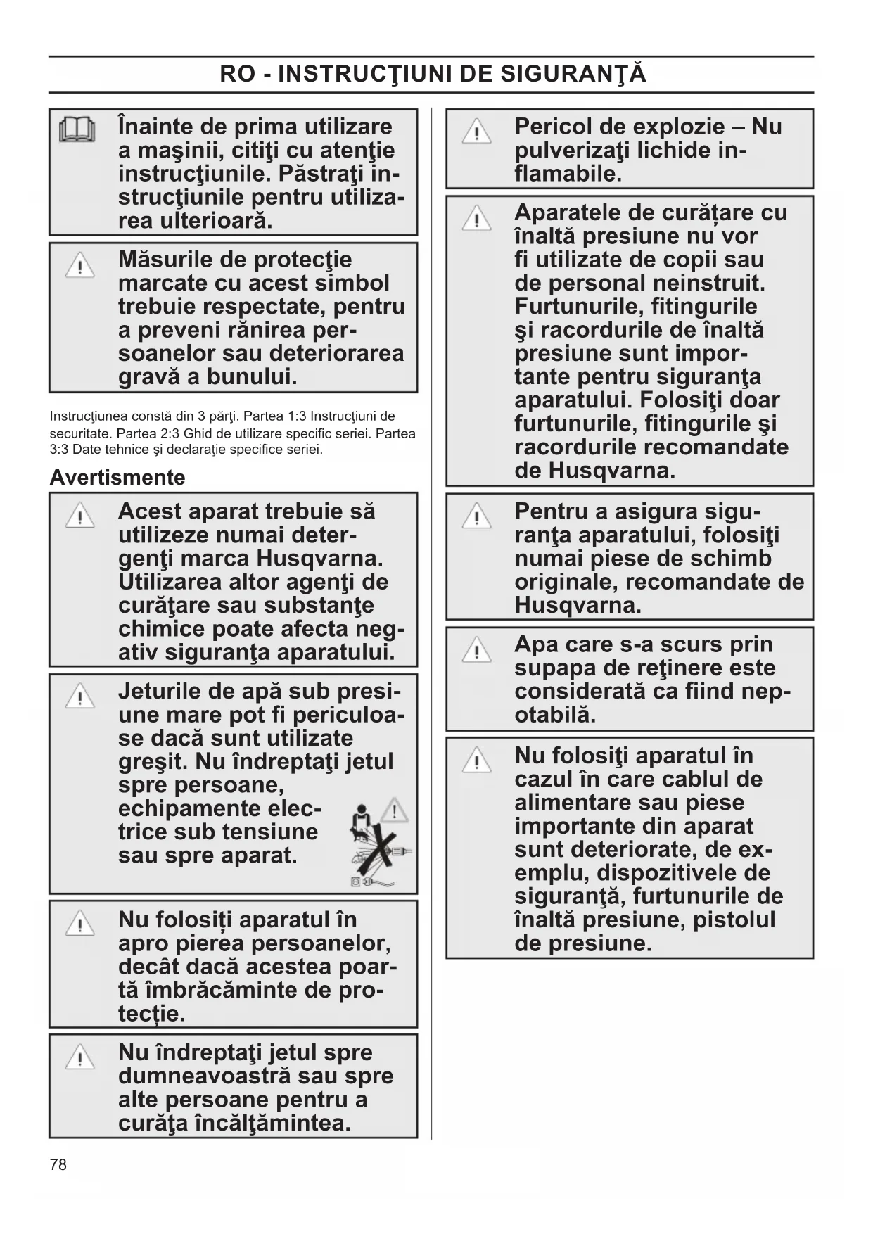 Înainte de prima utilizare a maşinii, citiţi cu atenţie instrucţiunile. Păstraţi in- strucţiunile pentru utiliza- rea ulterioară. Măsurile de protecţie marcate cu acest simbol trebuie respectate, pentru a preveni rănirea per- soanelor sau deteriorarea gravă a bunului. Instrucţiunea constă din 3 părţi. Partea 1:3 Instrucţiuni de securitate. Partea 2:3 Ghid de utilizare specic seriei. Partea 3:3 Date tehnice şi declaraţie specice seriei. Avertismente Acest aparat trebuie să utilizeze numai deter- genţi marca Husqvarna. Utilizarea altor agenţi de curăţare sau substanţe chimice poate afecta neg- ativ siguranţa aparatului. Jeturile de apă sub presi- une mare pot periculoa- se dacă sunt utilizate greşit. Nu îndreptaţi jetul spre persoane, echipamente elec- trice sub tensiune sau spre aparat. Nu folosiți aparatul în apro pierea persoanelor, decât dacă acestea poar- tă îmbrăcăminte de pro- tecție. Nu îndreptaţi jetul spre dumneavoastră sau spre alte persoane pentru a curăţa încălţămintea. Pericol de explozie – Nu pulverizaţi lichide in- amabile. Aparatele de curățare cu înaltă presiune nu vor utilizate de copii sau de personal neinstruit. Furtunurile, tingurile şi racordurile de înaltă presiune sunt impor- tante pentru siguranţa aparatului. Folosiţi doar furtunurile, tingurile şi racordurile recomandate de Husqvarna. Pentru a asigura sigu- ranţa aparatului, folosiţi numai piese de schimb originale, recomandate de Husqvarna. Apa care s-a scurs prin supapa de reţinere este considerată ca ind nep- otabilă. Nu folosiţi aparatul în cazul în care cablul de alimentare sau piese importante din aparat sunt deteriorate, de ex- emplu, dispozitivele de siguranţă, furtunurile de înaltă presiune, pistolul de presiune.79
