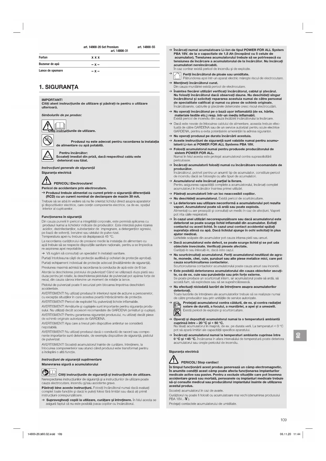 art. 14800-20 Set Premium art. 14800-31 art. 14800-55 Furtun x x x Buzunar de apă – x – Lance de spumare – x – v Încărcați numai acumulatoare Li-Ion de tipul POWER FOR ALL System PBA 18V. de la o capacitate de 1,5 Ah (începând cu 5 celule de acumulator). Tensiunea acumulatorului trebuie să se potrivească cu tensiunea de încărcare a acumulatorului de la încărcător. Nu încărcați acumulatori nereîncărcabili. În caz contrar există pericol de incendiu şi de explozie.