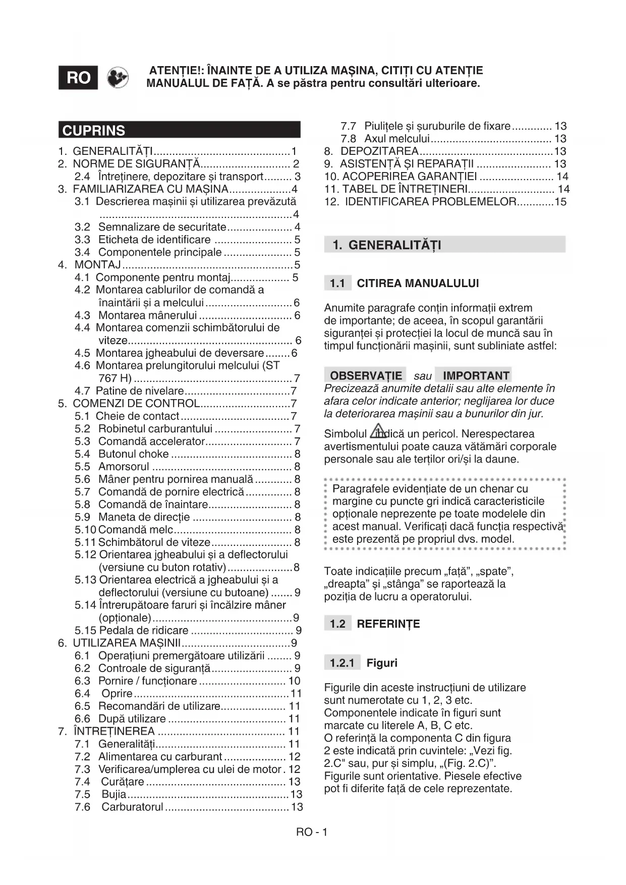 Figurile din aceste instrucțiuni de utilizare sunt numerotate cu 1, 2, 3 etc. Componentele indicate în guri sunt marcate cu literele A, B, C etc. O referință la componenta C din gura 2 este indicată prin cuvintele: „Vezi g. 2.C" sau, pur și simplu, „(Fig. 2.C)”. Figurile sunt orientative. Piesele efective pot diferite față de cele reprezentate. ATENŢIE!: ÎNAINTE DE A UTILIZA MAŞINA, CITIŢI CU ATENŢIE MANUALUL DE FAŢĂ. A se păstra pentru consultări ulterioare.