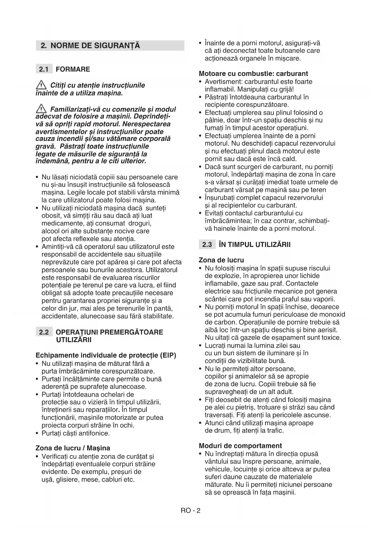 - Utilizarea pieselor de schimb și a accesoriilor neoriginale poate avea efecte negative asupra funcționării și siguranței mașinii. Constructorul nu își asumă nicio răspundere în caz de daune sau vătămări cauzate de aceste produse.RO - 10