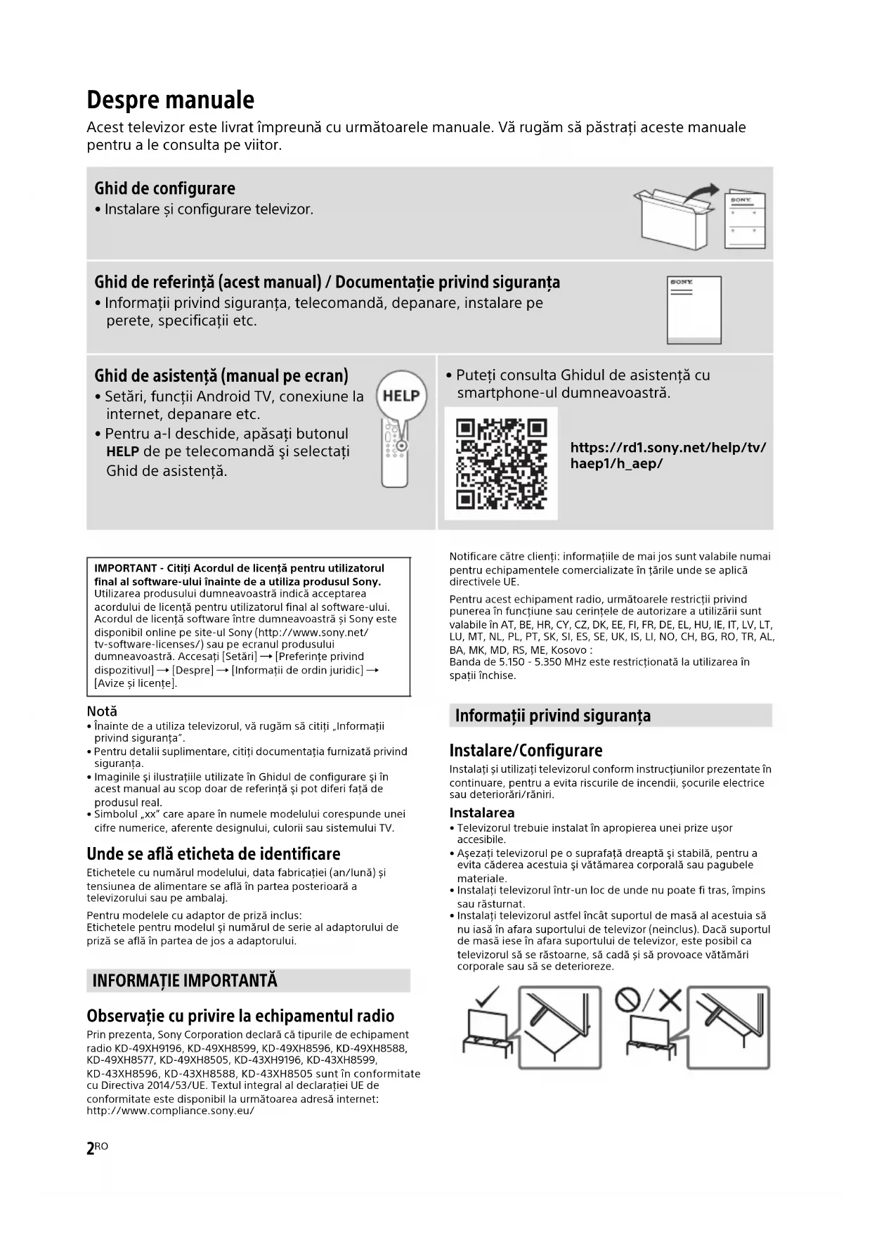 - Simbolul „xx” care apare în numele modelului corespunde unei cifre numerice, aferente designului, culorii sau sistemului TV. Unde se află eticheta de identificare Etichetele cu numărul modelului, data fabricaţiei (an/lună) și tensiunea de alimentare se află în partea posterioară a televizorului sau pe ambalaj. Pentru modelele cu adaptor de priză inclus: Etichetele pentru modelul şi numărul de serie al adaptorului de priză se află în partea de jos a adaptorului. Observaţie cu privire la echipamentul radio Prin prezenta, Sony Corporation declară că tipurile de echipament radio KD-49XH9196, KD-49XH8599, KD-49XH8596, KD-49XH8588, KD-49XH8577, KD-49XH8505, KD-43XH9196, KD-43XH8599, KD-43XH8596, KD-43XH8588, KD-43XH8505 sunt în conformitate cu Directiva 2014/53/UE. Textul integral al declarației UE de conformitate este disponibil la următoarea adresă internet: http://www.compliance.sony.eu/ Notificare către clienţi: informaţiile de mai jos sunt valabile numai pentru echipamentele comercializate în ţările unde se aplică directivele UE. Pentru acest echipament radio, următoarele restricţii privind punerea în funcţiune sau cerinţele de autorizare a utilizării sunt valabile în AT, BE, HR, CY, CZ, DK, EE, FI, FR, DE, EL, HU, IE, IT, LV, LT, LU, MT, NL, PL, PT, SK, SI, ES, SE, UK, IS, LI, NO, CH, BG, RO, TR, AL, BA, MK, MD, RS, ME, Kosovo : Banda de 5.150 - 5.350 MHz este restricţionată la utilizarea în spaţii închise. Instalare/Configurare Instalaţi și utilizaţi televizorul conform instrucţiunilor prezentate în continuare, pentru a evita riscurile de incendii, șocurile electrice sau deteriorări/răniri. Instalarea