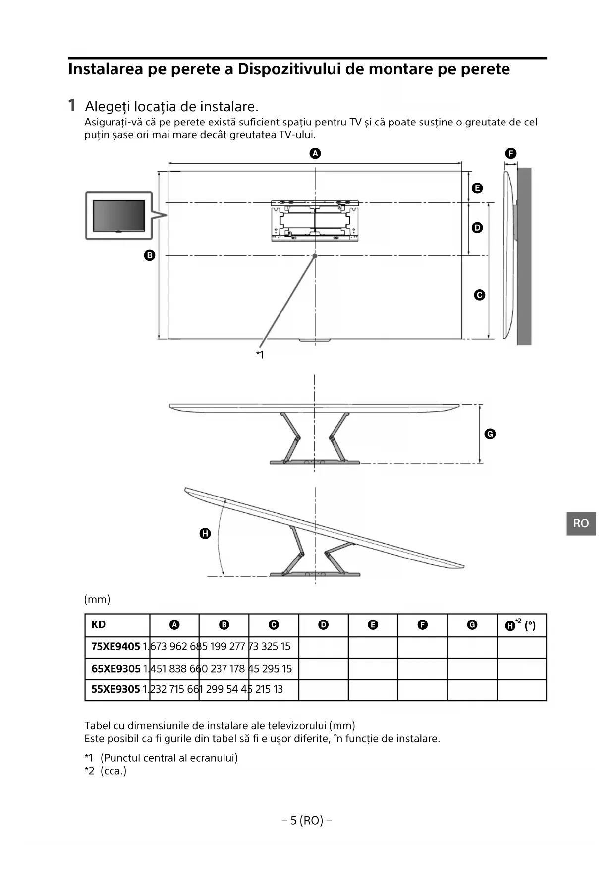 75XE9405 1.673 962 685 199 277 73 325 15 65XE9305 1.451 838 660 237 178 45 295 15 55XE9305 1.232 715 661 299 54 45 215 13 Tabel cu dimensiunile de instalare ale televizorului (mm) Este posibil ca fi gurile din tabel să fi e uşor diferite, în funcţie de instalare. *1 (Punctul central al ecranului) *2 (cca.)− 6 (RO) − Notă