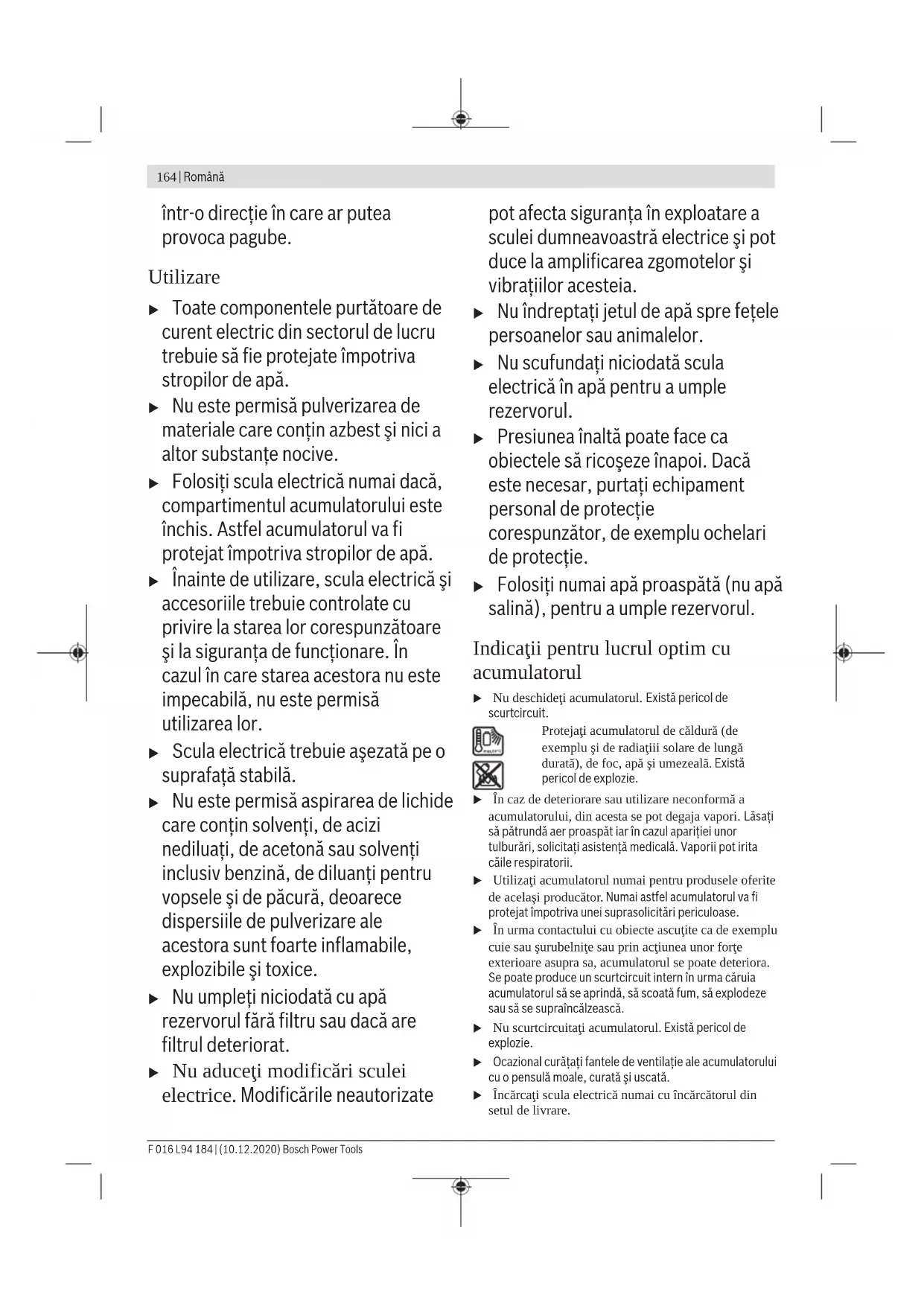 Бұл литий-иондық аккумуляторлар қауіпті тауарларға қойылатын талаптарға сай болуы керек. Пайдаланушы аккумуляторларды көшеде қосымша құжаттарсыз тасымалдай алады. Үшінші тұлғалар (мысалы, әуе көлігі немесе жіберу) орамаға және маркаларға қойылатын арнайы талаптарды сақтау керек. Жіберуге дайындау кезінде қауіпті жүктерді тасымалдау маманымен хабарласу керек. Аккумуляторды корпусы зақымдалған болса ғана жіберіңіз. Ашық түйіспелерді желімдеңіз және аккумуляторды орамада қозғалмайтындай ораңыз. Қажет болса, қосымша ұлттық ережелерді сақтаңыз. Кәдеге жарату Электр құралдары, аккумуляторлар, керек- жарақтар мен қаптама материалдары экологиялық тұрғыдан лайықты түрде кәдеге жаратылуы тиіс. Электр құралдарын және аккумуляторларды/батареяларды тұрмыстық қалдықтар контейнерлеріне тастамаңыз! Тек қана ЕО елдері үшін: Еуропа 2012/19/EU ережесі бойынша, қолдану үшін жарамсыз электр құралдары және, Еуропа 2006/66/EC ережесі бойынша, зақымдалған немесе тозған аккумуляторлар/батареялар іріктеліп жиналып,экологиялық тұрғыдан лайықты түрде кәдеге жаратылуы тиіс. Аккумуляторлар/батареялар: Литий-иондық: Тасымалдау бөліміндегі нұсқауларды орындаңыз (қараңыз „Тасымалдау“, Бет163). Română Instrucţiuni privind siguranţa şi protecţia muncii u AVERTISMENT! Citiţi toate instrucţiunile şi indicaţiile privind siguranţa. Nerespectarea instrucţiunilor şi indicaţiilor privind siguranţa poate provoca electrocutare, incendiu şi/sau răniri grave. Explicarea simbolurilor de pe scula electrică de grădină Indicaţie generală de avertizare a periculozităţii. Citiţi instrucţiunile de folosire. Nu îndreptaţi jetul de apă spre faţa oamenilor şi animalelor, asupra sculei electrice sau componentelor electrice. Manevrare u Utilizatorul poate folosi scula electrică numai conform destinaţiei. Trebuie luate în considerare condiţiile locale. În timpul lucrului fiţi conştienţi de necesitatea protejării altor persoane, în special a copiilor. u Nu permiteţi în niciun caz copiilor, persoanelor cu capacităţi fizice, senzoriale sau intelectuale limitate sau lipsite de experienţă şi/sau cunoştinţe şi/sau persoanelor nefamiliarizate cu prezentele instrucţiuni, să folosească scula electrică. Este posibil ca reglementările locale să limiteze vârsta operatorului. u Copiii trebuie supravegheaţi pentru a avea siguranţa că aceştia nu se joacă cu scula electrică. u Utiizatorul este responsabil pentru terţi aflaţi în sectorul de lucru. Aveți grijă să nu îndreptați jetul de apă Bosch Power Tools F 016 L94 184 | (10.12.2020)164 | Română într-o direcție în care ar putea provoca pagube. Utilizare u Toate componentele purtătoare de curent electric din sectorul de lucru trebuie să fie protejate împotriva stropilor de apă. u Nu este permisă pulverizarea de materiale care conţin azbest şi nici a altor substanţe nocive. u Folosiţi scula electrică numai dacă, compartimentul acumulatorului este închis. Astfel acumulatorul va fi protejat împotriva stropilor de apă. u Înainte de utilizare, scula electrică şi accesoriile trebuie controlate cu privire la starea lor corespunzătoare şi la siguranţa de funcţionare. În cazul în care starea acestora nu este impecabilă, nu este permisă utilizarea lor. u Scula electrică trebuie aşezată pe o suprafaţă stabilă. u Nu este permisă aspirarea de lichide care conţin solvenţi, de acizi nediluaţi, de acetonă sau solvenţi inclusiv benzină, de diluanţi pentru vopsele şi de păcură, deoarece dispersiile de pulverizare ale acestora sunt foarte inflamabile, explozibile şi toxice. u Nu umpleţi niciodată cu apă rezervorul fără filtru sau dacă are filtrul deteriorat. u Nu aduceţi modificări sculei electrice. Modificările neautorizate pot afecta siguranţa în exploatare a sculei dumneavoastră electrice şi pot duce la amplificarea zgomotelor şi vibraţiilor acesteia. u Nu îndreptaţi jetul de apă spre feţele persoanelor sau animalelor. u Nu scufundaţi niciodată scula electrică în apă pentru a umple rezervorul. u Presiunea înaltă poate face ca obiectele să ricoşeze înapoi. Dacă este necesar, purtaţi echipament personal de protecţie corespunzător, de exemplu ochelari de protecţie. u Folosiţi numai apă proaspătă (nu apă salină), pentru a umple rezervorul. Indicaţii pentru lucrul optim cu acumulatorul u Nu deschideţi acumulatorul. Există pericol de scurtcircuit. Protejaţi acumulatorul de căldură (de exemplu şi de radiaţiii solare de lungă durată), de foc, apă şi umezeală. Există pericol de explozie. u În caz de deteriorare sau utilizare neconformă a acumulatorului, din acesta se pot degaja vapori. Lăsaţi să pătrundă aer proaspăt iar în cazul apariţiei unor tulburări, solicitaţi asistenţă medicală. Vaporii pot irita căile respiratorii. u Utilizaţi acumulatorul numai pentru produsele oferite de acelaşi producător. Numai astfel acumulatorul va fi protejat împotriva unei suprasoli