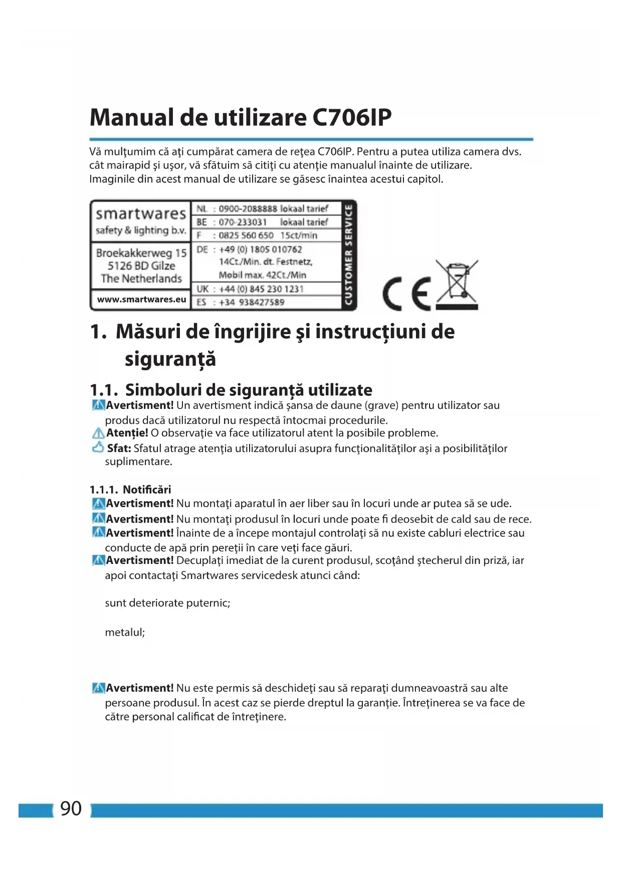 Erre a készülékre határozott idejű, 3 éves garancia érvényes. A garanciális feltételeket itt találja: www.smartwares.eu.90 Manual de utilizare C706IP Vă mulţumim că aţi cumpărat camera de reţea C706IP. Pentru a putea utiliza camera dvs. cât mairapid şi uşor, vă sfătuim să citiţi cu atenţie manualul înainte de utilizare. Imaginile din acest manual de utilizare se găsesc înaintea acestui capitol. www.smartwares.eu