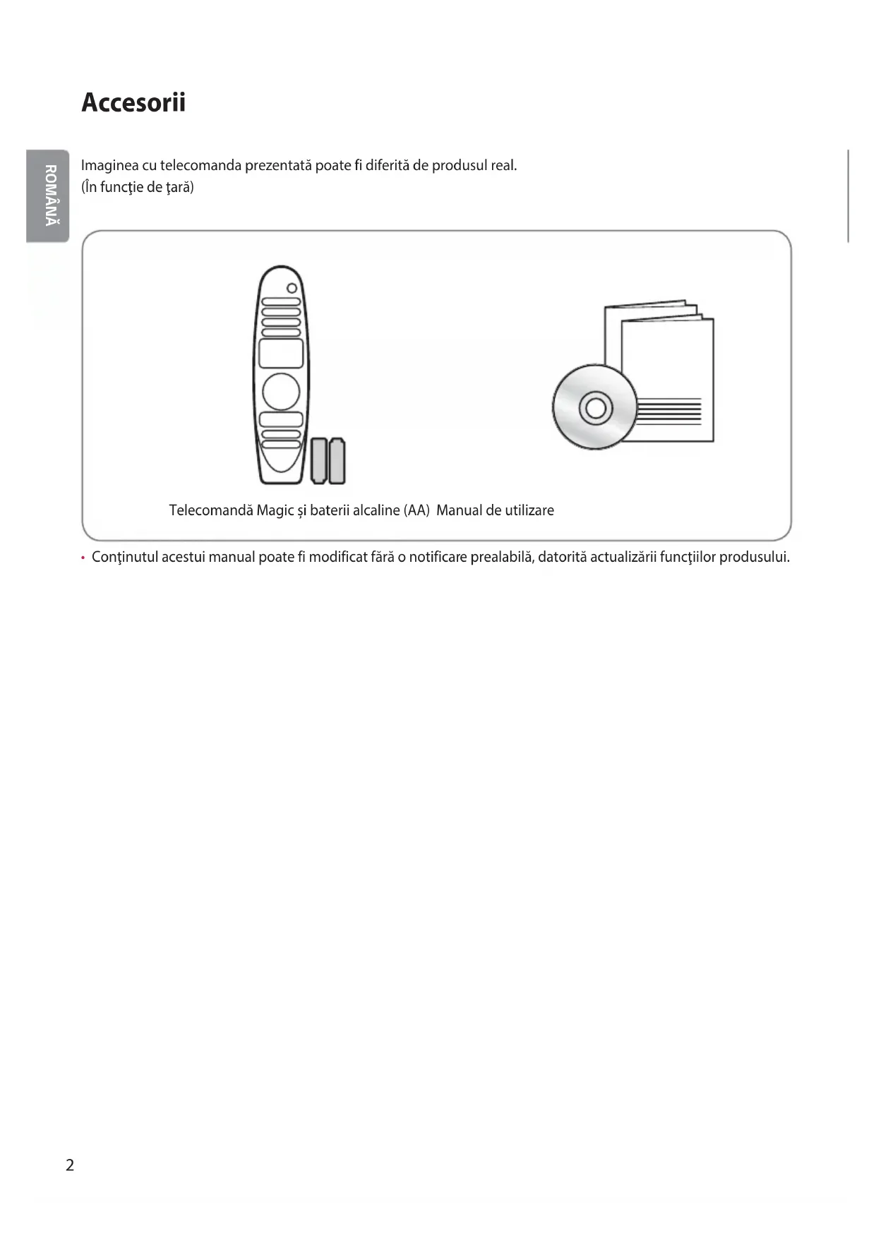 Accesorii Imaginea cu telecomanda prezentată poate fi diferită de produsul real. (În funcţie de ţară) Telecomandă Magic și baterii alcaline (AA) Manual de utilizare Ţ Conţinutul acestui manual poate fi modificat fără o notificare prealabilă, datorită actualizării funcţiilor produsului.30./Á