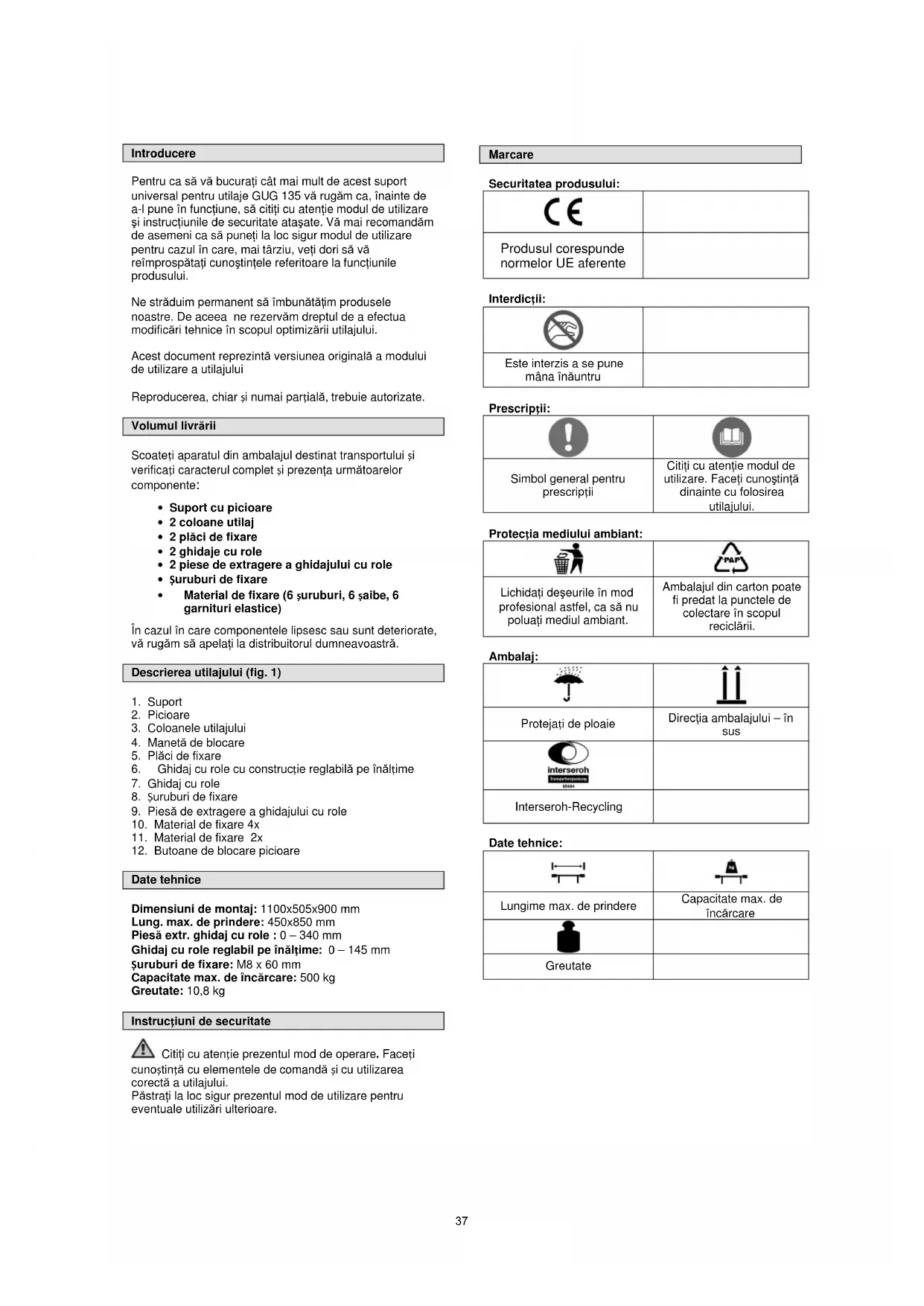 Date tehnice Dimensiuni de montaj: 1100x505x900 mm Lung. max. de prindere: 450x850 mm Piesă extr. ghidaj cu role : 0 – 340 mm Ghidaj cu role reglabil pe înălțime: 0 – 145 mm Șuruburi de fixare: M8 x 60 mm Capacitate max. de încărcare: 500 kg Greutate: 10,8 kg Instrucțiuni de securitate CitiŃi cu atenție prezentul mod de operare. Faceți cunoștință cu elementele de comandă și cu utilizarea corectă a utilajului. PăstraŃi la loc sigur prezentul mod de utilizare pentru eventuale utilizări ulterioare. Marcare Securitatea produsului: Produsul corespunde normelor UE aferente Interdicții: Este interzis a se pune mâna înăuntru Prescripții: Simbol general pentru prescripții CitiŃi cu atenŃie modul de utilizare. FaceŃi cunoştinŃă dinainte cu folosirea utilajului. Protecția mediului ambiant: LichidaŃi deşeurile în mod profesional astfel, ca să nu poluaŃi mediul ambiant. Ambalajul din carton poate fi predat la punctele de colectare în scopul reciclării. Ambalaj: Protejați de ploaie DirecŃia ambalajului – în sus Interseroh-Recycling Date tehnice: Lungime max. de prindere Capacitate max. de încărcare Greutate 37Pregătire Citiți cu atenție modul de operare și de întreținere. Faceți cunoștință temeinică cu instalațiile de comandă și cu utilizarea reglementară a utilajului. Trebuie să știți cum funcționează utilajul și cum se poate deconecta rapid instalația de comandă. Nu lăsați niciodată copiii să lucreze pe utilaj. Nu lăsați niciodată oamenii maturi să lucreze pe utilaj fără o instruire reglementară. Nu lăsați pe nimeni să intre la locul de muncă, îndeosebi copiii mici și animalele domestice. Fiți atenți pentru a evita alunecarea sau căderea. Utilizarea în conformitate cu destinaŃia Suportul universal pentru utilaje este construit în exclusivitate în scopul prinderii utilajelor/instalațiilor electrice care pot fi fixate temeinic de cadrul suportului. Utilizatorul este răspunzător de fixarea sigură. Cu acest aparat nu se pot face alte lucrări decât cele pentru care a fost construit, lucrări care sunt descrise în modul de operare. Orișice altă utilizare este considerată a fi contrarie destinației. Producătorul nu garantează pagubele și accidentele ulterioare. Aveți în vedere faptul că acest aparat nu a fost conceput pentru o utilizare industrială. Montaj Montajul pe suport (fig. 2-4)