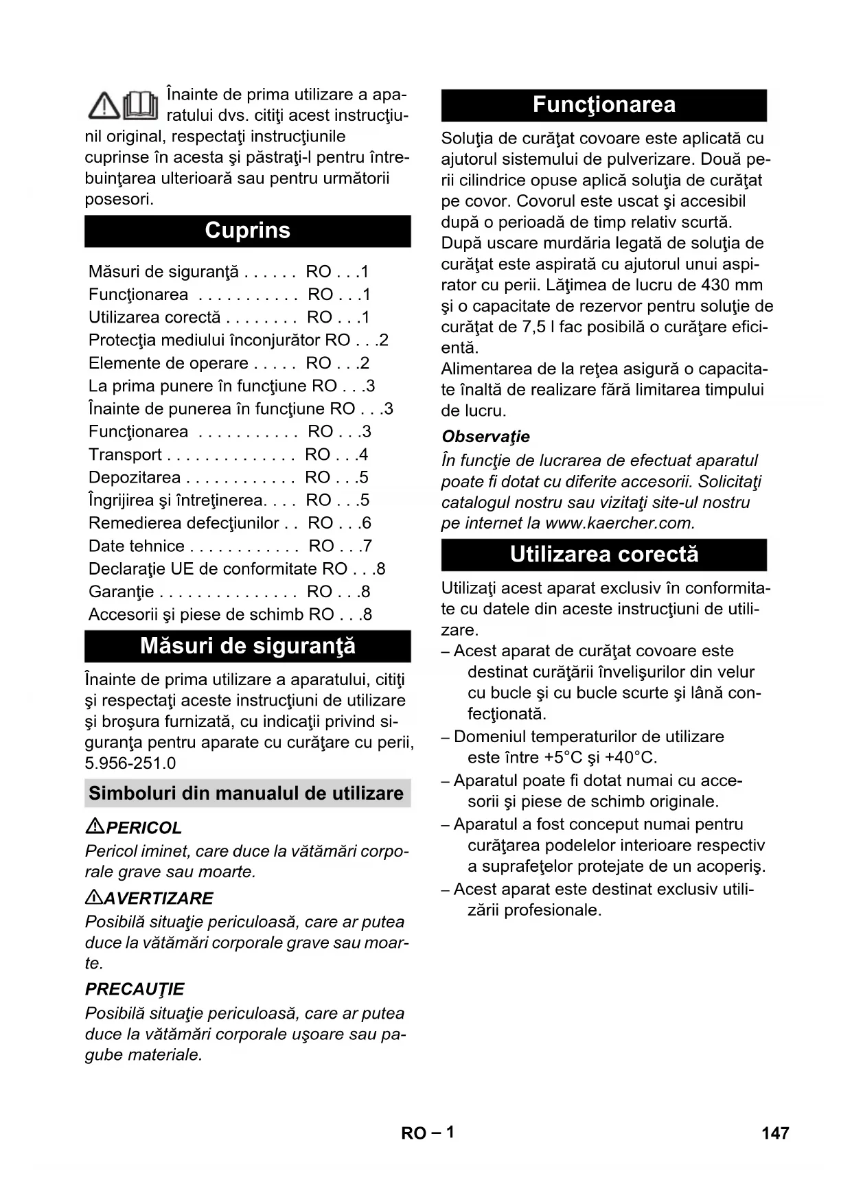 - Chairman of the Board of Management Director Regulatory Affairs & Certification Gwarancja Wyposażenie dodatkowe i części zamienne 146 PL– 1 Înainte de prima utilizare a apa- ratului dvs. citiţi acest instrucţiu- nil original, respectaţi instrucţiunile cuprinse în acesta şi păstraţi-l pentru între- buinţarea ulterioară sau pentru următorii posesori. Înainte de prima utilizare a aparatului, citiţi şi respectaţi aceste instrucţiuni de utilizare şi broşura furnizată, cu indicaţii privind si- guranţa pentru aparate cu curăţare cu perii, 5.956-251.0 PERICOL Pericol iminet, care duce la vătămări corpo- rale grave sau moarte. 몇 AVERTIZARE Posibilă situaţie periculoasă, care ar putea duce la vătămări corporale grave sau moar- te. PRECAUŢIE Posibilă situaţie periculoasă, care ar putea duce la vătămări corporale uşoare sau pa- gube materiale. Soluţia de curăţat covoare este aplicată cu ajutorul sistemului de pulverizare. Două pe- rii cilindrice opuse aplică soluţia de curăţat pe covor. Covorul este uscat şi accesibil după o perioadă de timp relativ scurtă. După uscare murdăria legată de soluţia de curăţat este aspirată cu ajutorul unui aspi- rator cu perii. Lăţimea de lucru de 430 mm şi o capacitate de rezervor pentru soluţie de curăţat de 7,5 l fac posibilă o curăţare efici- entă. Alimentarea de la reţea asigură o capacita- te înaltă de realizare fără limitarea timpului de lucru. Observaţie În funcţie de lucrarea de efectuat aparatul poate fi dotat cu diferite accesorii. Solicitaţi catalogul nostru sau vizitaţi site-ul nostru pe internet la www.kaercher.com. Utilizaţi acest aparat exclusiv în conformita- te cu datele din aceste instrucţiuni de utili- zare. – Acest aparat de curăţat covoare este destinat curăţării învelişurilor din velur cu bucle şi cu bucle scurte şi lână con- fecţionată. – Domeniul temperaturilor de utilizare este între +5°C şi +40°C. – Aparatul poate fi dotat numai cu acce- sorii şi piese de schimb originale. – Aparatul a fost conceput numai pentru curăţarea podelelor interioare respectiv a suprafeţelor protejate de un acoperiş. – Acest aparat este destinat exclusiv utili- zării profesionale. Cuprins Măsuri de siguranţă