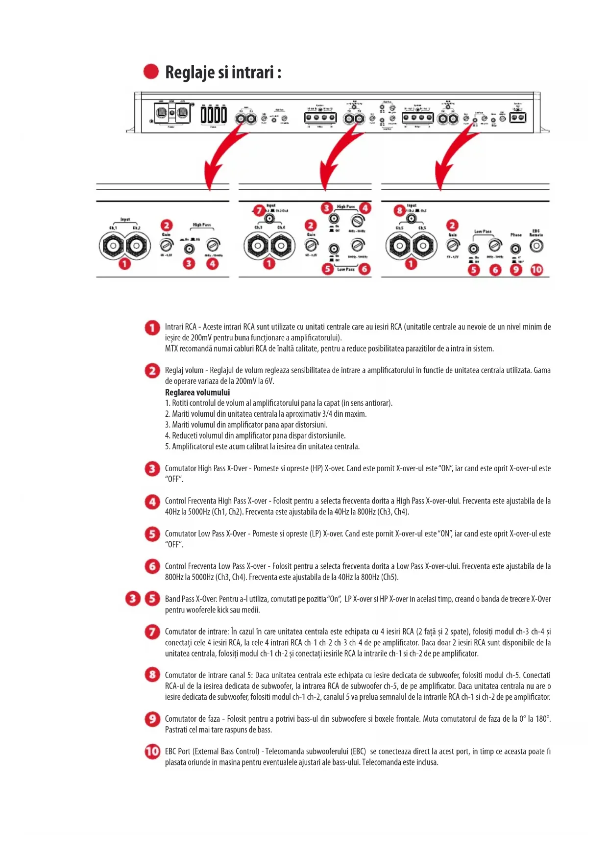 Comutator High Pass X-Over - Porneste si opreste (HP) X-over. Cand este pornit X-over-ul este “ON”, iar cand este oprit X-over-ul este “OFF”. Control Frecventa High Pass X-over - Folosit pentru a selecta frecventa dorita a High Pass X-over-ului. Frecventa este ajustabila de la 40Hz la 5000Hz (Ch1, Ch2). Frecventa este ajustabila de la 40Hz la 800Hz (Ch3, Ch4). Comutator Low Pass X-Over - Porneste si opreste (LP) X-over. Cand este pornit X-over-ul este “ON”, iar cand este oprit X-over-ul este “OFF”. Control Frecventa Low Pass X-over - Folosit pentru a selecta frecventa dorita a Low Pass X-over-ului. Frecventa este ajustabila de la 800Hz la 5000Hz (Ch3, Ch4). Frecventa este ajustabila de la 40Hz la 800Hz (Ch5). Band Pass X-Over: Pentru a-l utiliza, comutati pe pozitia “On”, LP X-over si HP X-over in acelasi timp, creand o banda de trecere X-Over pentru wooferele kick sau medii. Comutator de intrare: În cazul în care unitatea centrala este echipata cu 4 iesiri RCA (2 față și 2 spate), folosiți modul ch-3 ch-4 și conectați cele 4 iesiri RCA, la cele 4 intrari RCA ch-1 ch-2 ch-3 ch-4 de pe amplificator. Daca doar 2 iesiri RCA sunt disponibile de la unitatea centrala, folosiți modul ch-1 ch-2 și conectați iesirile RCA la intrarile ch-1 si ch-2 de pe amplificator. Comutator de intrare canal 5: Daca unitatea centrala este echipata cu iesire dedicata de subwoofer, folositi modul ch-5. Conectati RCA-ul de la iesirea dedicata de subwoofer, la intrarea RCA de subwoofer ch-5, de pe amplificator. Daca unitatea centrala nu are o iesire dedicata de subwoofer, folositi modul ch-1 ch-2, canalul 5 va prelua semnalul de la intrarile RCA ch-1 si ch-2 de pe amplificator. Comutator de faza - Folosit pentru a potrivi bass-ul din subwoofere si boxele frontale. Muta comutatorul de faza de la 0° la 180°. Pastrati cel mai tare raspuns de bass. EBC Port (External Bass Control) - Telecomanda subwooferului (EBC) se conecteaza direct la acest port, in timp ce aceasta poate fi plasata oriunde in masina pentru eventualele ajustari ale bass-ului. Telecomanda este inclusa. Reglaje si intrari :Manual de instructiuni - MTX RFL5300 Alimentarea si conexiunile difuzoarelor : Ground Terminal - Este necesara o conexiune masa adecvata pentru ca amplificatorul dumneavoastra sa functioneze la performante maxime. Ar trebui folosit un cablul de masa scurt, la acelasi diametru ca si cablul de alimentare, pentru a conecta terminalul de masa direct la caroseria masinii. Remote Terminal - Amplificatorul poate fi pornit prin conectarea la 12V a acestui terminal. De obicei aceasta tensiune este furnizata de firul ce pleaca de la unitatea centrala si pe care scrie “remote” sau “power antenna”. (+12) Power Terminal - Aceasta este intrarea principala de alimentare a amplificatorului si trebuie conectata direct la borna de plus a bateriei, pentru o functionare corecta. Aveti grija la instalarea cablului de alimentare (12V) in masina. Evitati pozitionarea cablului de alimentare langa RCA-uri, cablul de antena sau alte echipamente sensibile care din cauza tensiunii pot induce zgomote (paraziti) in sistemul audio. De asemenea este foarte important sa avem o conexiune bine stransa, sigura, pentru performanta maxima. MTX recomanda utilizarea cablului de alimentare de 50mm2 cu amplificatorul MTX RFL5300. Sigurante - Cand se ard sigurantele, inlocuiti-le cu altele de acelasi amperaj. Nu folositi niciodata o siguranta cu amperaj mai mare! Terminale pentru difuzoare - Conectati difuzoarele la aceste terminale. Tineti cont de polaritatea difuzoarelor in intregul sistem. Inversarea polaritatii poate duce la pierderea basului si/sau la o calitate slaba a sunetului. Modul in punte: Can d conec tati amplificatorul in punte, folo siti ter minalul st ang pen tru alimentar e si terminalul drept pentru ma sa. Atentie: Nu conectati amplificatorul in punte cu o impedanta mai mica de 4 Ohmi. Atentie: Canalul 5 este mono, nu folositi o impedanta mai mica de 2 Ohmi pe acest canal. Instalarea si montajul : MTX recomanda ca noul tau amplificator sa fie instalat de unul din dealerii autorizati MTX. Orice abatere de la intructiunile de insta- lare specificate poate provoca daune grave amplificatorului, difuzoarelor si/sau sistemului electric al masinii. Daunele provocate de instalarea necorespunzatoare nu sunt acoperite de garantie. Va rugam sa verificati toate conexiunile inainte de pornirea sistemului.