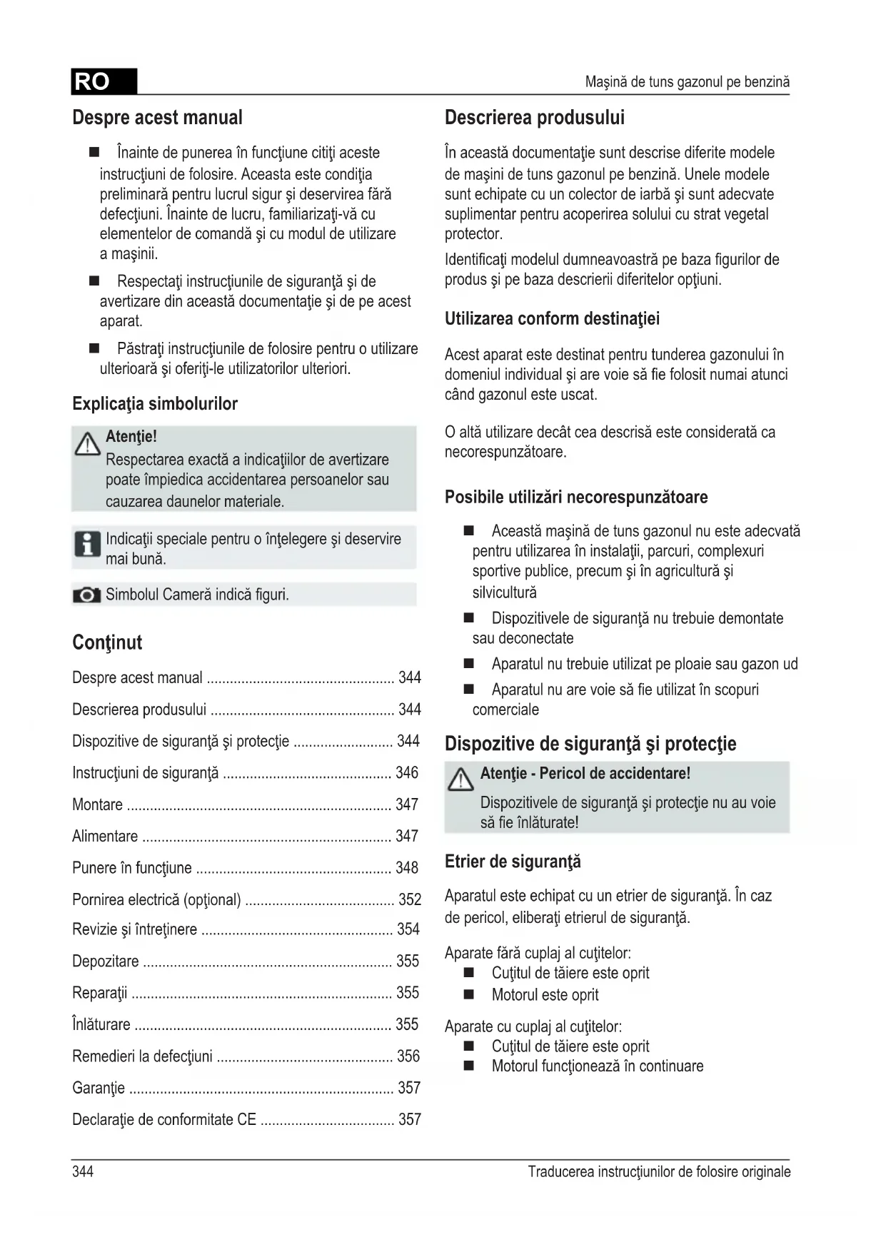 - Maşină de tuns gazonul pe benzină Conţinut Despre acest manual p. 344