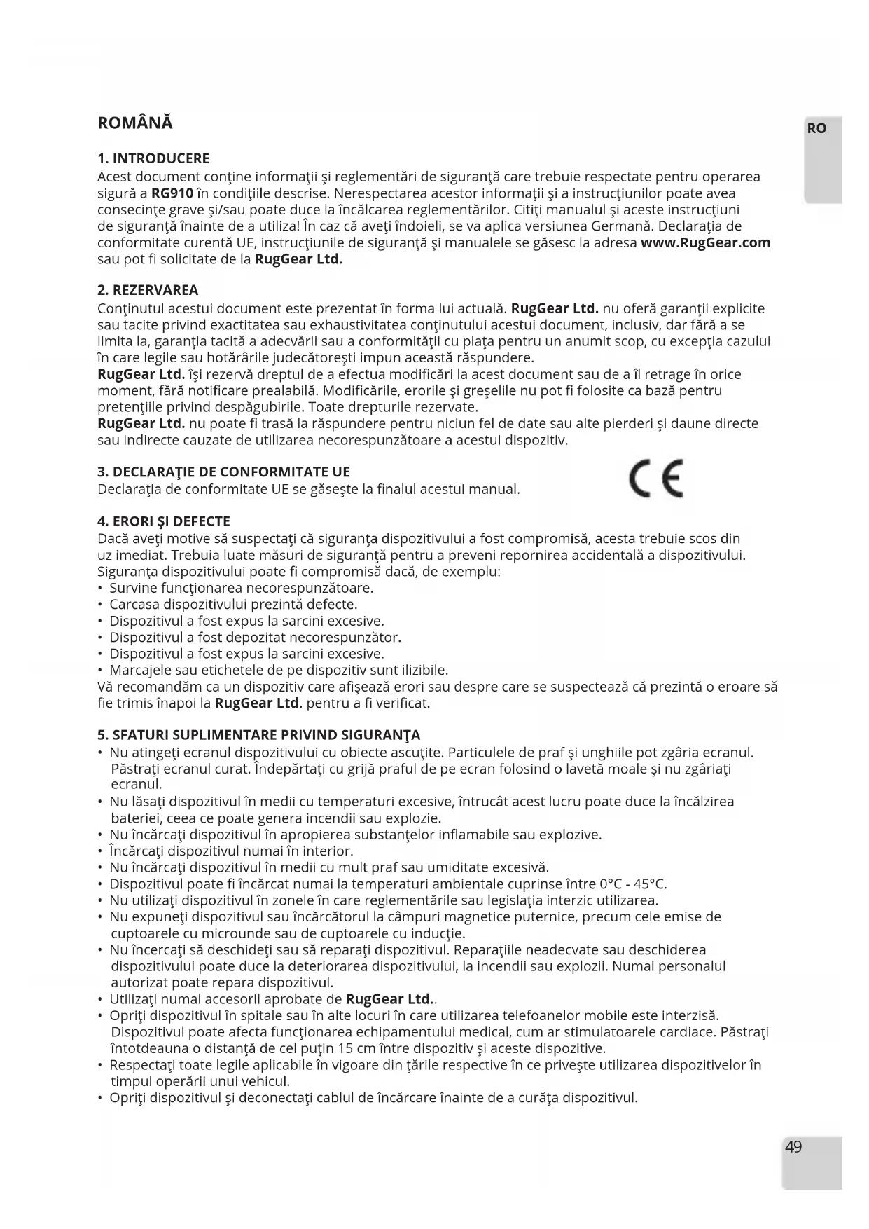 Acest document conţine informaţii şi reglementări de siguranţă care trebuie respectate pentru operarea sigură a RG910 în condiţiile descrise. Nerespectarea acestor informaţii şi a instrucţiunilor poate avea consecinţe grave şi/sau poate duce la încălcarea reglementărilor. Citiţi manualul şi aceste instrucţiuni de siguranţă înainte de a utiliza! În caz că aveţi îndoieli, se va aplica versiunea Germană. Declaraţia de conformitate curentă UE, instrucţiunile de siguranţă şi manualele se găsesc la adresa www.RugGear.com sau pot solicitate de la RugGear Ltd.
