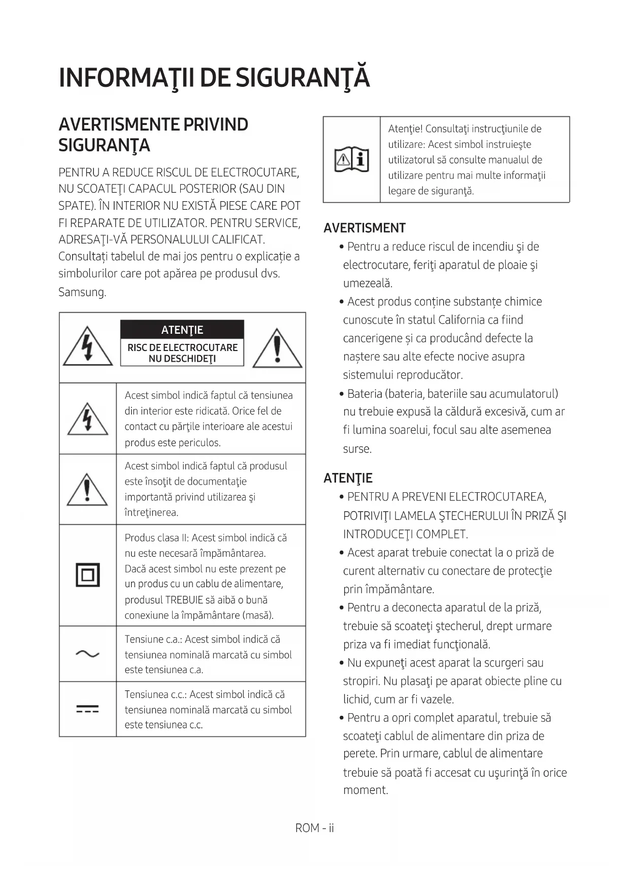 - Într-un mediu extrem de rece sau de cald, încărcarea se oprește, pentru siguranță. Pentru a rezolva aceste probleme, deconectați cablul de alimentare cu c.a. și reconectați-l când temperatura este între 5°C și 35°C.ROM - 31 Prin prezenta, Samsung declară că acest echipament radio respectă Directiva 2014/53/UE și cerințele legale relevante din Regatul Unit. Textul complet al declarației de conformitate este disponibil la următoarea adresă de internet: http://www.samsung.com. Accesați secțiunea Asistență și introduceți numele modelului. Acest echipament poate să e utilizat în toate țările din Uniunea Europeană și din Regatul Unit. [Dispoziţiiprivindeliminareacorectăabateriiloracestuiprodus] (Aplicabilînțăricusistemedecolectareseparate) Acest marcaj de pe baterie, de pe manualul de utilizare sau de pe ambalaj indică faptul că bateriile acestui produs nu trebuie eliminate împreună cu alte deşeuri menajere la sfârşitul ciclului lor de viaţă. Dacă sunt marcate, simbolurile chimice Hg, Cd sau Pb indică faptul că bateria conţine mercur, cadmiu sau plumb peste nivelurile de referinţă prevăzute în Directiva CE 2006/66. În cazul în care bateriile nu sunt eliminate corespunzător, aceste substanţe pot dăunătoare pentru sănătatea omului sau pentru mediu. În vederea protejării resurselor naturale şi a promovării refolosirii materialelor, vă rugăm să separaţi bateriile de celelalte tipuri de deşeuri şi să le reciclaţi prin intermediul sistemului gratuit de returnare a bateriilor la nivel local. Cumseeliminăcorectacestprodus (Deșeurideechipamenteelectriceșielectronice) (Aplicabilînțăricusistemedecolectareseparate) Acest simbol de pe produs, accesorii şi documentaţie indică faptul că produsul şi accesoriile sale electronice (încărcător, căşti, cablu USB) nu trebuie eliminate împreună cu alte deşeuri menajere la nalul duratei lor de utilizare. Dat ind că eliminarea necontrolată a deşeurilor poate dăuna mediului înconjurător sau sănătăţii umane, vă rugăm să separaţi aceste articole de alte tipuri de deşeuri şi să le reciclaţi în mod responsabil, promovând astfel reutilizarea durabilă a resurselor materiale. Utilizatorii casnici trebuie să-l contacteze pe distribuitorul care le-a vândut produsul sau să se intereseze la autorităţile locale unde şi cum pot să ducă aceste articole pentru a reciclate în mod ecologic. Utilizatorii comerciali trebuie să-şi contacteze furnizorul şi să consulte termenii şi condiţiile din contractul de achiziţie. Acest produs şi accesoriile sale electronice nu trebuie eliminate împreună cu alte deşeuri comerciale. Pentru informații despre angajamentele Samsung privind mediul și despre obligațiile de reglementare specice produsului, de ex. REACH, WEEE, Baterii, accesați: www.samsung.com/uk/aboutsamsung/sustainability/environment/our-commitment/data/SER - ii SIGURNOSNE INFORMACIJE SIGURNOSNA UPOZORENJA