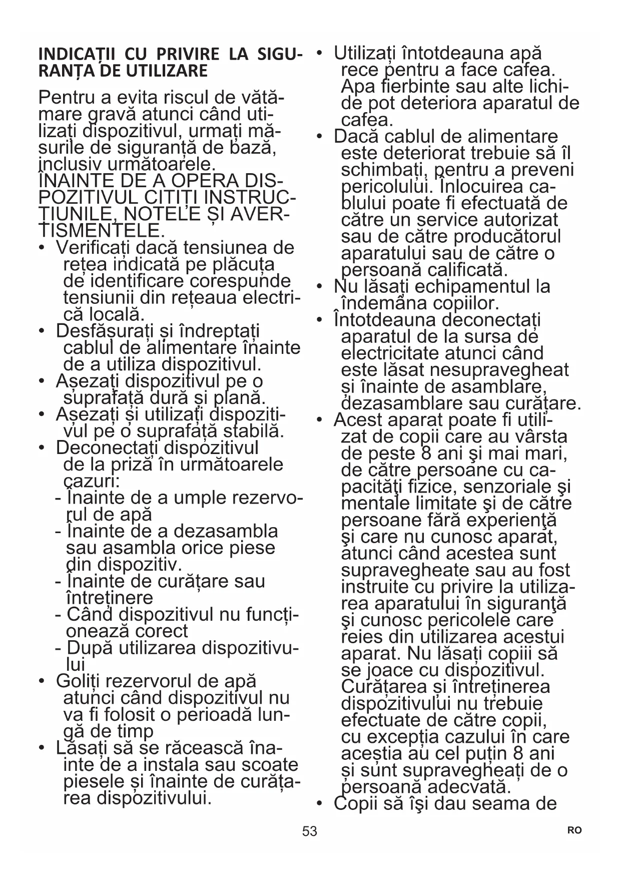 - Copii să îşi dau seama de RO54 pericolele care pot apărea, pe durata utilizării aparate- lor electrice; de aceea nu lăsaţi aparatul la îndemâna copiilor.