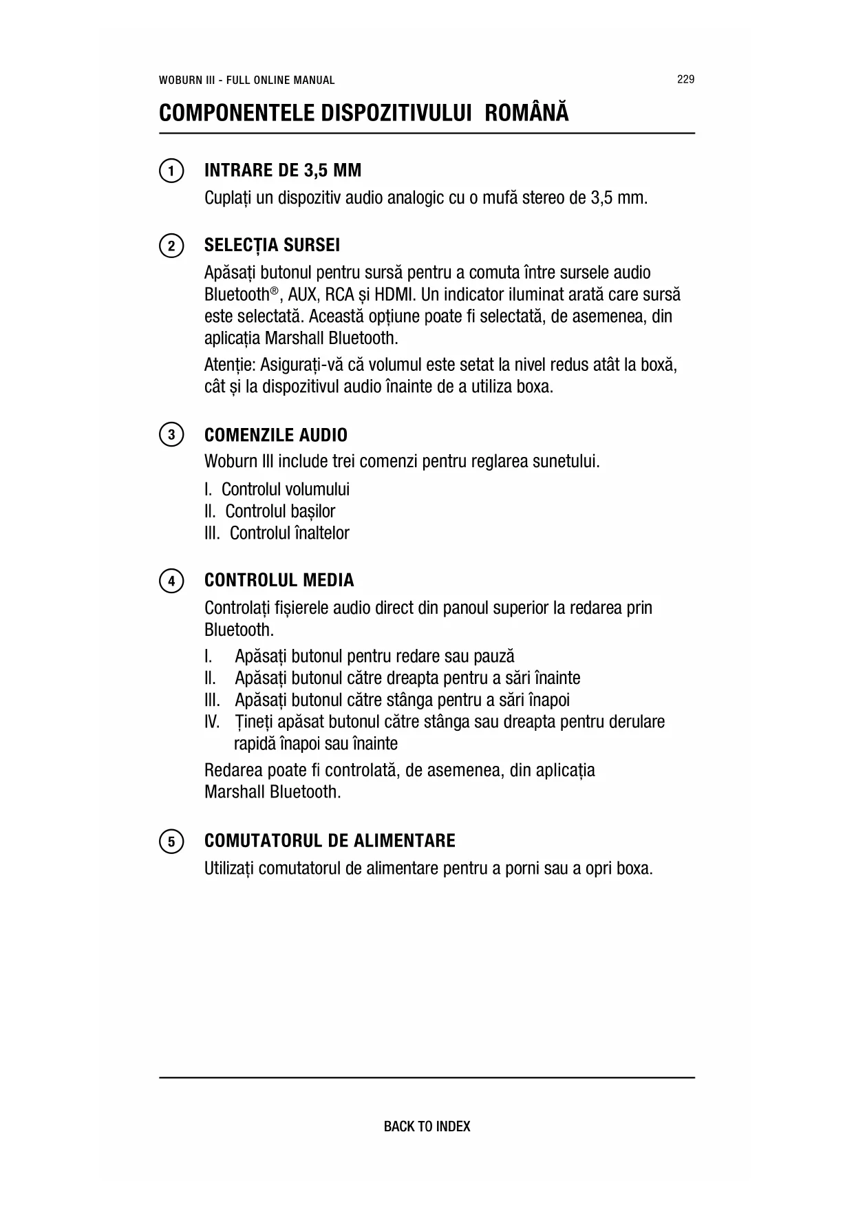 , AUX, RCA și HDMI. Un indicator iluminat arată care sursă este selectată. Această opțiune poate fi selectată, de asemenea, din aplicația Marshall Bluetooth. Atenție: Asiguraț i-vă că volumul este setat la nivel redus atât la boxă, cât și la dispozitivul audio înainte de a utiliza boxa.