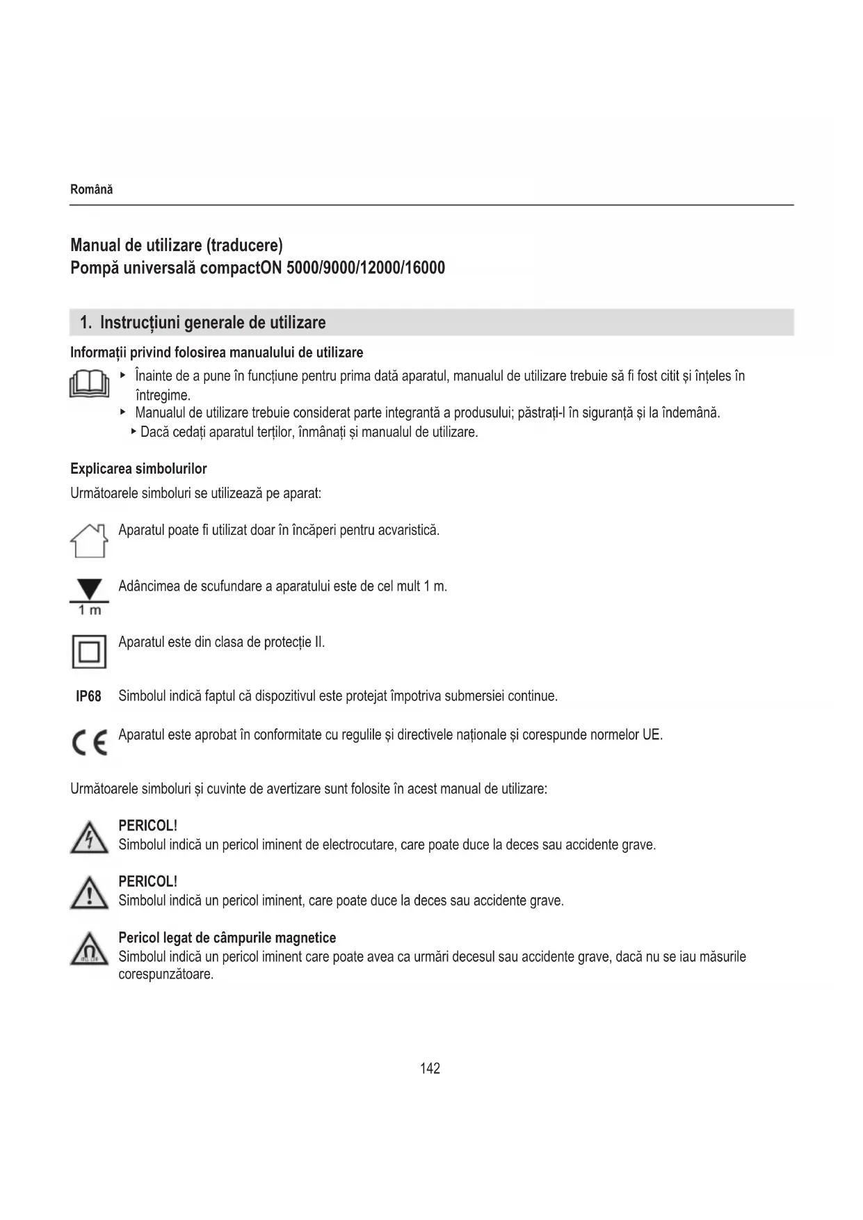 Pogledajte str. 3.142 Română Manual de utilizare (traducere) Pompă universală compactON 5000/9000/12000/16000