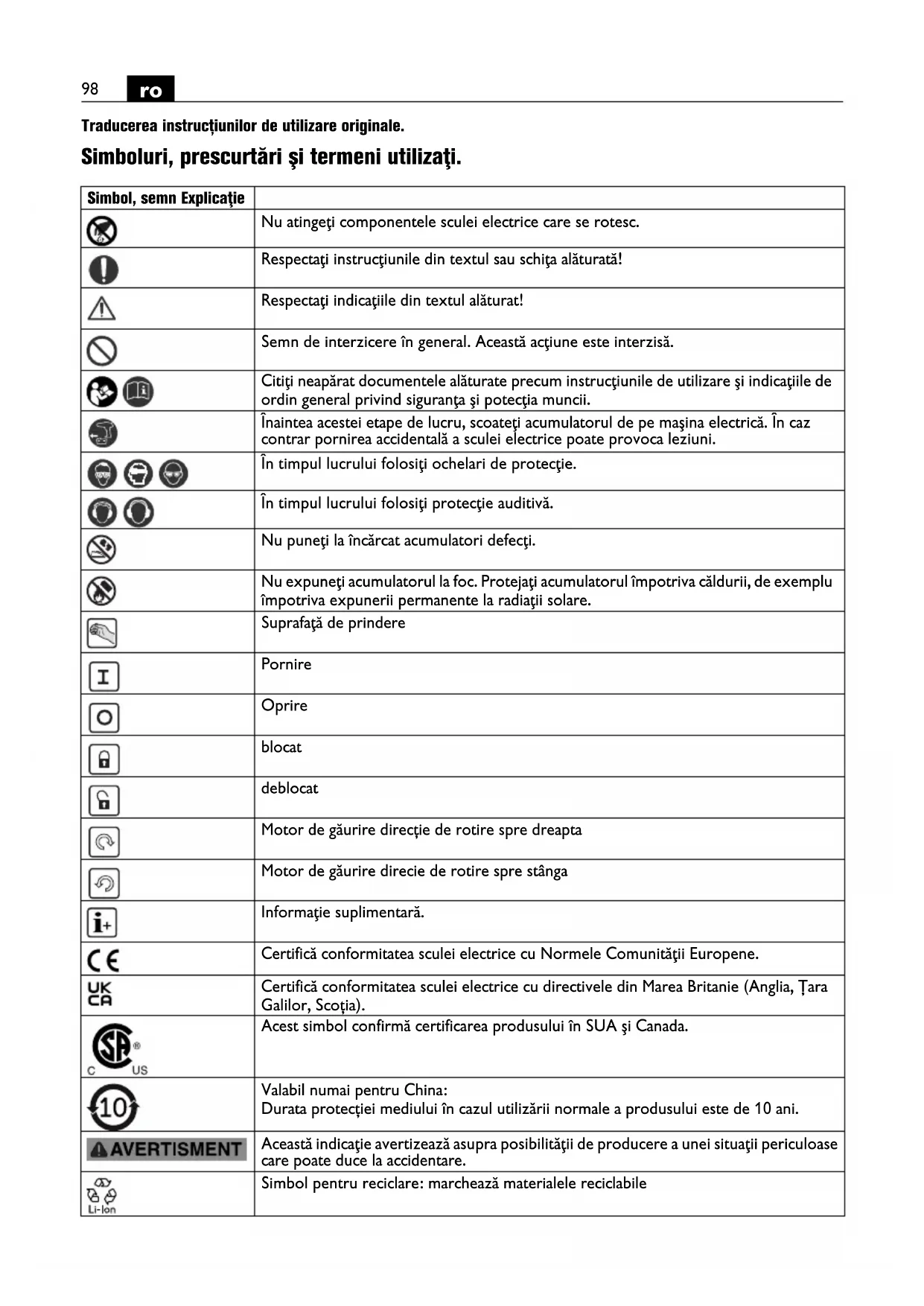 Traducerea instrucțiunilor de utilizare originale. Simboluri, prescurtări şi termeni utilizaţi. Simbol, semn Explicaţie Nu atingeţi componentele sculei electrice care se rotesc. Respectaţi instrucţiunile din textul sau schiţa alăturată! Respectaţi indicaţiile din textul alăturat! Semn de interzicere în general. Această acţiune este interzisă. Citiţi neapărat documentele alăturate precum instrucţiunile de utilizare şi indicaţiile de ordin general privind siguranţa şi potecţia muncii. Înaintea acestei etape de lucru, scoateţi acumulatorul de pe maşina electrică. În caz contrar pornirea accidentală a sculei electrice poate provoca leziuni. În timpul lucrului folosiţi ochelari de protecţie. În timpul lucrului folosiţi protecţie auditivă. Nu puneţi la încărcat acumulatori defecţi. Nu expuneţi acumulatorul la foc. Protejaţi acumulatorul împotriva căldurii, de exemplu împotriva expunerii permanente la radiaţii solare. Suprafaţă de prindere Pornire Oprire blocat deblocat Motor de găurire direcție de rotire spre dreapta Motor de găurire direcie de rotire spre stânga Informaţie suplimentară. Certifică conformitatea sculei electrice cu Normele Comunităţii Europene. Certifică conformitatea sculei electrice cu directivele din Marea Britanie (Anglia, Țara Galilor, Scoția). Acest simbol confirmă certificarea produsului în SUA şi Canada. Valabil numai pentru China: Durata protecției mediului în cazul utilizării normale a produsului este de 10 ani. Această indicaţie avertizează asupra posibilităţii de producere a unei situaţii periculoase care poate duce la accidentare. Simbol pentru reciclare: marchează materialele reciclabile99
