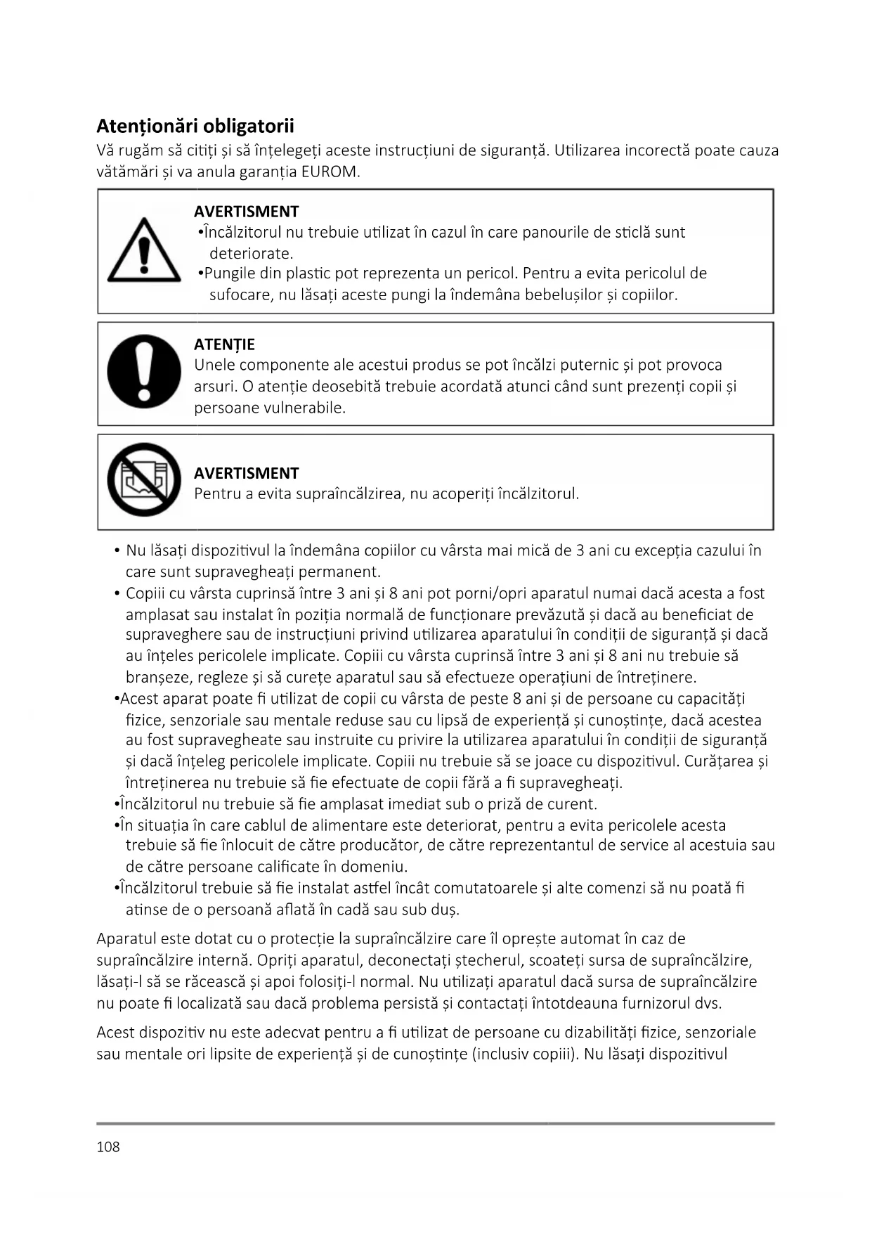 - Pungile din plasc pot reprezenta un pericol. Pentru a evita pericolul de sufocare, nu lăsați aceste pungi la îndemâna bebelușilor și copiilor. ATENȚIE Unele componente ale acestui produs se pot încălzi puternic și pot provoca arsuri. O atenție deosebită trebuie acordată atunci când sunt prezenți copii și persoane vulnerabile. AVERTISMENT Pentru a evita supraîncălzirea, nu acoperiți încălzitorul.