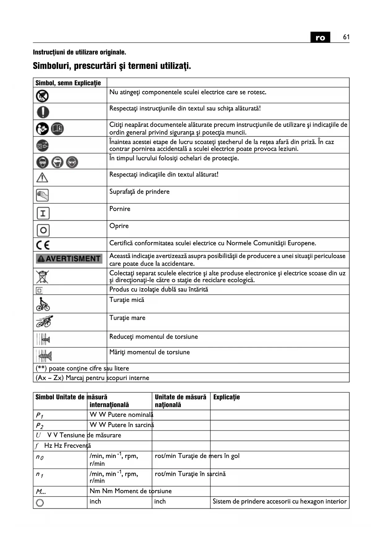 Instrucţiuni de utilizare originale. Simboluri, prescurtări şi termeni utilizaţi. Simbol, semn Explicaţie Nu atingeţi componentele sculei electrice care se rotesc. Respectaţi instrucţiunile din textul sau schiţa alăturată! Citiţi neapărat documentele alăturate precum instrucţiunile de utilizare şi indicaţiile de ordin general privind siguranţa şi potecţia muncii. Înaintea acestei etape de lucru scoateţi ştecherul de la reţea afară din priză. În caz contrar pornirea accidentală a sculei electrice poate provoca leziuni. În timpul lucrului folosiţi ochelari de protecţie. Respectaţi indicaţiile din textul alăturat! Suprafaţă de prindere Pornire Oprire Certifică conformitatea sculei electrice cu Normele Comunităţii Europene. Această indicaţie avertizează asupra posibilităţii de producere a unei situaţii periculoase care poate duce la accidentare. Colectaţi separat sculele electrice şi alte produse electronice şi electrice scoase din uz şi direcţionaţi-le către o staţie de reciclare ecologică. Produs cu izolaţie dublă sau întărită Turaţie mică Turaţie mare Reduceţi momentul de torsiune Măriţi momentul de torsiune (**) poate conţine cifre sau litere (Ax – Zx) Marcaj pentru scopuri interne Simbol Unitate de măsură internaţională Unitate de măsură naţională Explicaţie