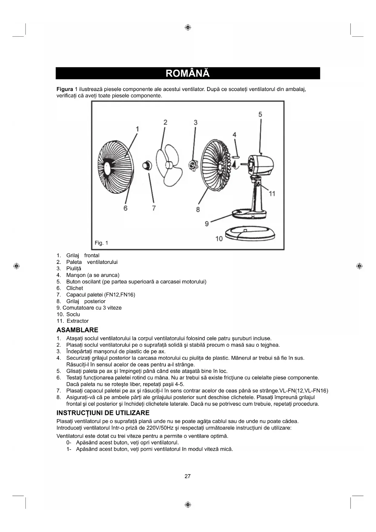 Plasaţi ventilatorul pe o suprafaţă plană unde nu se poate agăţa cablul sau de unde nu poate cădea. Introduceţi ventilatorul într-o priză de 220V/50Hz şi respectaţi următoarele instrucţiuni de utilizare: Ventilatorul este dotat cu trei viteze pentru a permite o ventilare optimă.