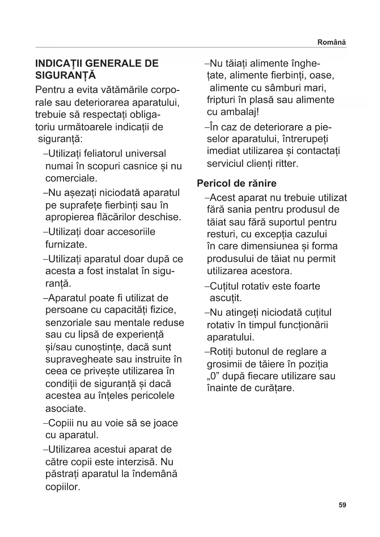 SIGURANȚĂ Pentru a evita vătămările corpo- rale sau deteriorarea aparatului, trebuie să respectați obliga- toriu următoarele indicații de siguranță: – Utilizați feliatorul universal numai în scopuri casnice și nu comerciale. – Nu așezați niciodată aparatul pe suprafețe erbinți sau în apropierea ăcărilor deschise. – Utilizați doar accesoriile furnizate. – Utilizați aparatul doar după ce acesta a fost instalat în sigu- ranță. – Aparatul poate utilizat de persoane cu capacități zice, senzoriale sau mentale reduse sau cu lipsă de experiență și/sau cunoștințe, dacă sunt supravegheate sau instruite în ceea ce privește utilizarea în condiții de siguranță și dacă acestea au înțeles pericolele asociate. – Copiii nu au voie să se joace cu aparatul. – Utilizarea acestui aparat de către copii este interzisă. Nu păstrați aparatul la îndemână copiilor. – Nu tăiați alimente înghe- țate, alimente erbinți, oase, alimente cu sâmburi mari, fripturi în plasă sau alimente cu ambalaj! – În caz de deteriorare a pie- selor aparatului, întrerupeți imediat utilizarea și contactați serviciul clienți ritter. Pericol de rănire – Acest aparat nu trebuie utilizat fără sania pentru produsul de tăiat sau fără suportul pentru resturi, cu excepția cazului în care dimensiunea și forma produsului de tăiat nu permit utilizarea acestora. – Cuțitul rotativ este foarte ascuțit. – Nu atingeți niciodată cuțitul rotativ în timpul funcționării aparatului. – Rotiți butonul de reglare a grosimii de tăiere în poziția „0” după ecare utilizare sau înainte de curățare. Română60 Desfaceți gracele de la începutul și sfârșitul acestui manual. Citiți cu atenție instrucțiunile de operare înainte de punerea în funcțiune a aparatului. Păstrați instrucțiunile de operare și trans- miteți-le mai departe eventualilor proprietari. Alternativ, instrucțiunile actuale de operare sunt disponibile la adresa www.ritterwerk.de. UTILIZARE CONFORM DESTINAȚIEI Feliatorul universal manual servește la tăierea alimentelor pentru uz casnic. Toate feliatoarele universale sunt adecvate pentru contactul cu alimentele. Utilizarea necorespunzătoare sau operarea incorectă poate duce la vătămări corporale grave sau la deteriorarea aparatului. În acest caz, toate pretențiile care decurg din garanție și răspundere devin nule.