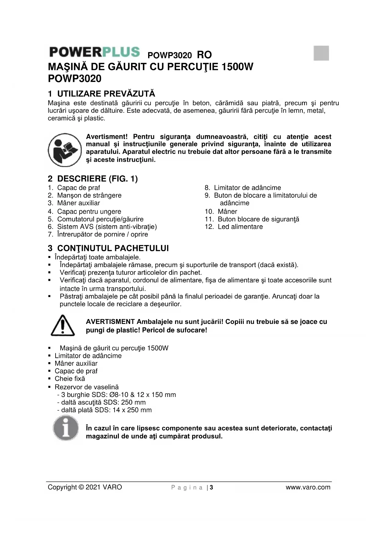 - Scula nedemontată trebuie înapoiată comerciantului într-o stare acceptabilă de curăţenie, (în cutia sa originală dacă e cazul) şi împreună cu dovada cumpărării. 15 MEDIU În cazul în care aparatul trebuie înlocuit după utilizare intensă, nu îl aruncaţi laolaltă cu gunoiul menajer, ci depozitaţi-l într-un mod sigur pentru mediu. Deşeurile produse de părţi ale maşinilor electrice nu trebuie manipulate la fel cu gunoiul menajer. Reciclaţi atunci când există această posibilitate, Pentru recomandări privind reciclarea, consultaţi autorităţile locale sau magazinul de achiziţie.POWP3020 RO Copyright © 2021 VARO P a g i n a | 11 www.varo.com